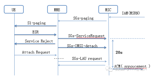 (3)UE返回LTE网络,尚未发起TAU流程,但看到空口的寻呼消息后,会立即发起寻呼响应消息