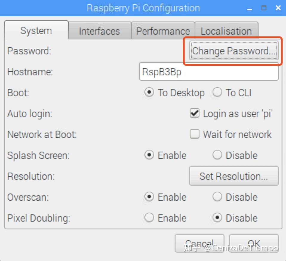 再经过一堆乱七八糟谁也不在意的过程过后终于就处于到了Raspbian桌面,用ISO镜像写盘的直接就是这一步,这时候会有两个有实际含义的提醒,一个是说请更改默认密码的提示框,如果不设置的话每天开启到桌面就会跳出来,非常讨厌。另一个是raspb-config对话框树莓派 默认密码,如图: