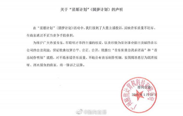 酷狗直播表示,在“星愿计划”(圆梦计划)活动中,接到了大量主播投诉,反映音乐品质不达标,有顾客通过不正当竞争方式获利。