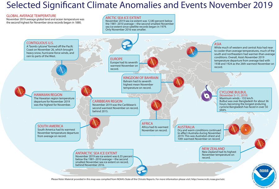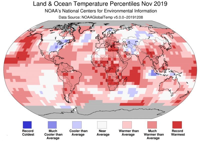 而就在2019年的12月16日,美国国家海衍理局(NOAA)又报道了一杆堪忧的事实,那就2019年11月成为140年来第二热,这意味着地侨了。
