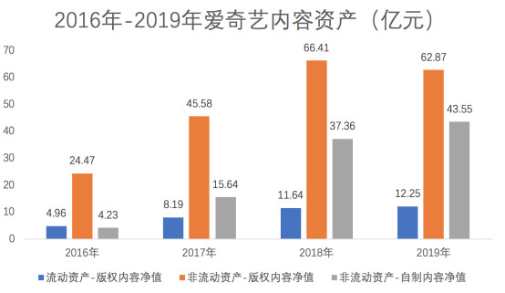 数据显示,爱奇艺在2016年,2017年,2018年和2019年的自制内容净资产余额分别为4.13亿元,15.64亿元,37.36亿元和43.55亿元.