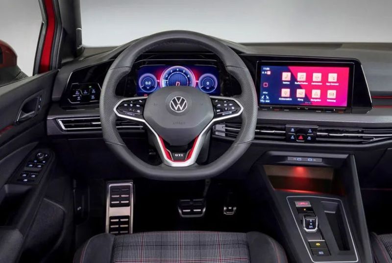 第八代高尔夫GTI的内部布局与普通版本基本相同. 主要变化是在方向盘,座椅和扶手箱上增加了红色缝线.