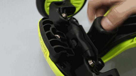 ▲将车把插入卡槽后,下面还有一个锁定开关. 将其推入锁定状态,以使车把和车身完全组装在一起.
