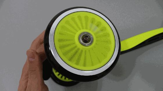▲对于踏板车,我首先要关心的是车轮部分. 车轮的质量将直接影响汽车的使用寿命. 该踏板车使用PU车轮,车轮侧面带有酷炫的骑行徽标. 它相对耐磨耐用,直径为120mm.