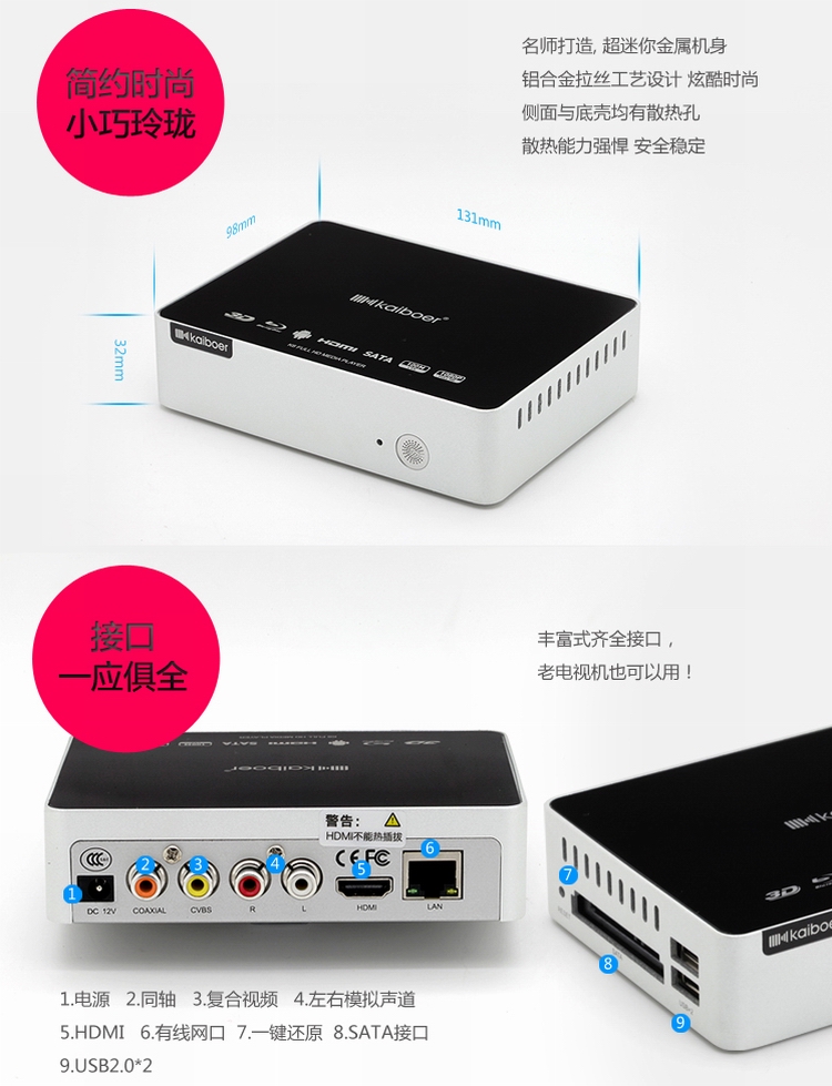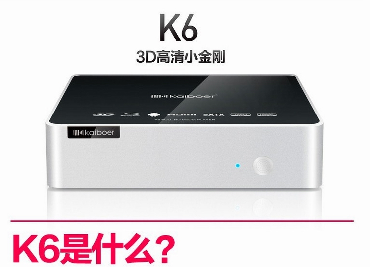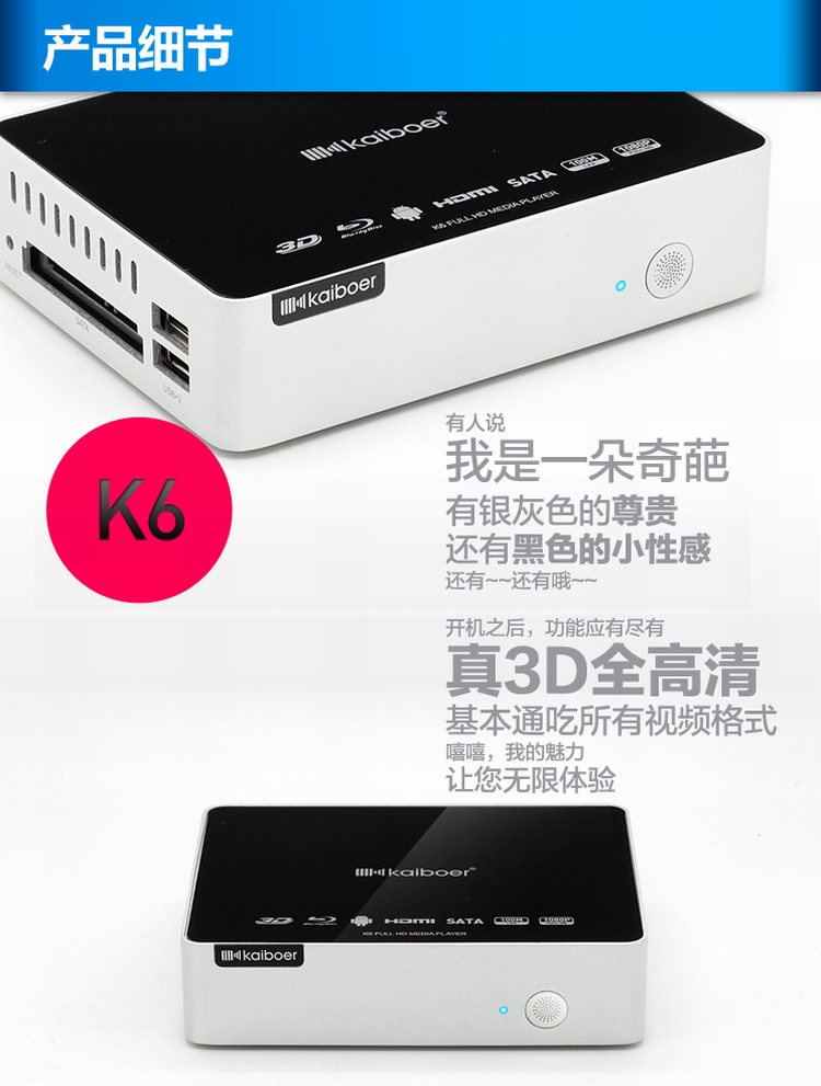 kaiboer开博尔K6二代高清播放器,采用RT1186芯片,内存512M DDR3,主频750Mhz,支持3D影片解码,可输出至偏振、快门式3D电视。蓝光导航显示,1080P完美输出。全铝机身,KIUI 3.0人性化系统,内置了多个播放平台。音质方面,开博尔K6支持DTS-HD、DOLBY环绕音效,通过HDMI解码,完美输出,实现看3D,听3D的效果。接口方面,搭载USB*2、eSATA接口,能使用大部分移动存储设备。让您的3D电视不再成为摆设品!开博尔K6支持所有3D格式,并兼容所有3D电视,完美真3D输出!