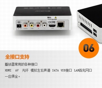 本机配备百兆网口,通过有线可观看上万部最新电影、电视以及几百个主流直播电视台,直播电视台还支持一周回看功能,如需连接无线WIFI网络信号,需用户自备一个realtek8191方案无线网卡方可实现。