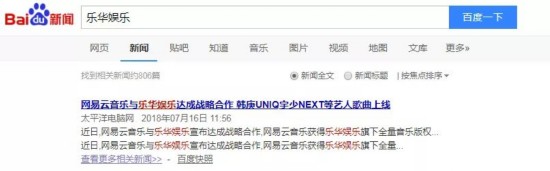 在百度新闻上搜索乐华娱乐时,乐华娱乐与网易云音乐达成战略合作的官方公告消息也出现在搜索结果的第一位. 同时,可以收听网易云音乐上乐华艺术家的歌曲.