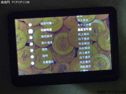 顺便再来看一下图片功能的设置选项,V8000HDV可以由播放暂停键控制图片的幻灯片放映,菜单中可以设定4种播放间隔时间、16种切换效果、3种播放顺序。我们也能获知图片的详细信息,可对图片进行缩放和旋转操作,也可将图片随心设为背景壁纸。