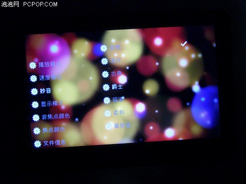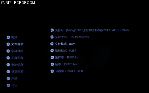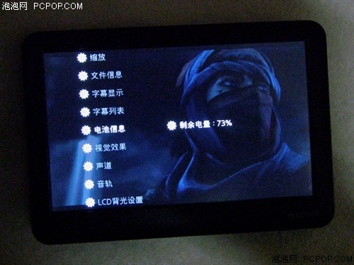 此外,在视频播放选项里,我们可以选择5种比例缩放,查看文件信息,开关字幕显示,查看字幕列表,查看电池信息,设置5种视觉效果,选择声道,切换音轨以及设置LCD背光亮度,可进行的操作十分全面。