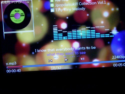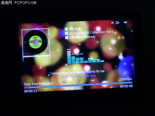 进入音乐播放后,可以选择音乐路径,其后选择音乐显示分类。进入播放界面,专辑封面、频谱条、歌曲信息、同步歌词、播放进度条都得以显示。短按M键可以切换至播放设置菜单,我们能够选择5种播放模式、5种速度模式、7种妙音音效、两种歌词显示模式、10种歌词非焦点颜色、10种歌词焦点颜色,并可以查看文件信息、电池信息以及进行LCD背光亮度设置。V8000HDV支持歌词显示,当有匹配的LRC歌词文件时候会自动识别并在屏幕上显示。