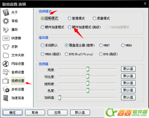 2、在设置选项中,点击“视频设置”选项卡,然后点击“流畅模式”开启流畅模式,或者点击“硬件加速模式”开启硬件加速