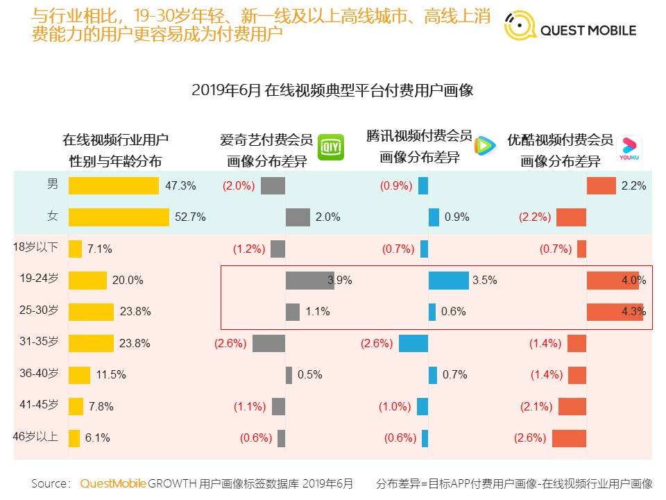 据Quest Mobile Research Institute发布的《2019年支付市场半年报告》显示,2019年6月,爱奇艺、腾讯视频和优酷的付费用户年龄在19-30岁之间最多,分别是90后和00后