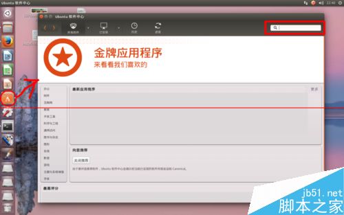 1、首先启动 Ubuntu 软件中心。一般情况下,软件中心可以从系统左侧的导航栏中直接启动,点击即可。如果软件中心图标没有出现,那就轻敲一下Windows徽标键,打开搜索窗口,输入"软件中心",即可启动。