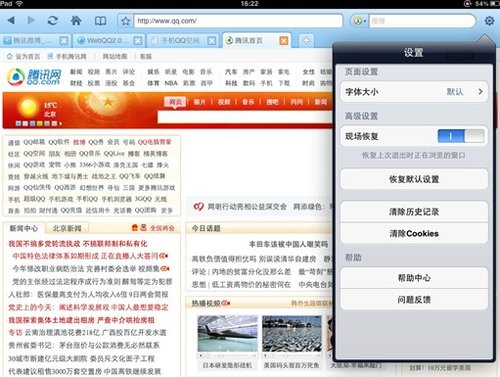 QQ浏览器设计师似乎已经注意到,许多PC浏览器用户对野生动物园的使用习惯都不满意,因此他们是基于PC浏览器的习惯和出色的触摸屏体验,简单而高质量的UI设计,专门定制的适用于iPad用户专用的QQ浏览器. 根据经验,编辑认为该产品的主要功能体现在四个方面: 人性化的多个搜索框,多个选项卡页面切换窗口,现场恢复和网站导航.