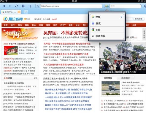 iPad的QQ浏览器左上角的搜索框默认为腾讯SOSO. 通过下拉列表,用户可以选择使用百度,谷歌,维基百科进行快速搜索. 让用户拥有更多的搜索选项,这反映了产品设计的人性化,也符合PC浏览器用户的习惯.