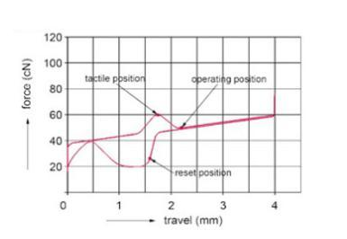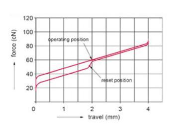 以下坐标图还显示了在横坐标行程(击键,单位: mm)和纵坐标力(厘力,即克力,单位: cN)下对应于按下和重置的黑轴的变化. 可以看出,黑轴的压制过程确实如丝般柔滑(假设您使其足够牢固),复位过程会有点卡住,但通常不会感觉到.