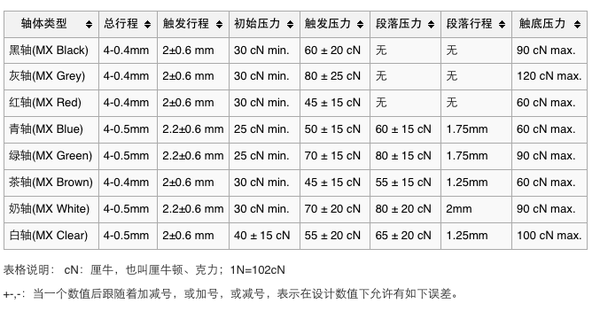 段落指示是否有段落感. 黑轴,灰轴和红轴没有段落. 他们直接上下移动并按到底. 其他轴具有段感,并且在按下时会发出“喀哒”声,就像开关一样.