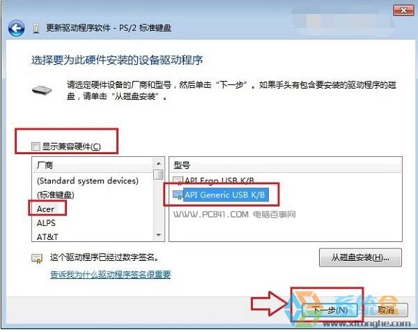 6. 下一步“选择要为此硬件安装的设备驱动程序”设置非常重要. 首先,去掉[显示兼容硬件]前面的复选标记,然后从制造商那里选择任何其他笔记本电脑品牌. 例如,作者使用联想笔记本电脑. 在这里,我们故意选择“ Acer”制造商,然后选择右侧的任何一种型号,完成后单击下面的[Next],如下图所示.