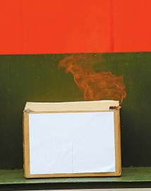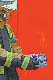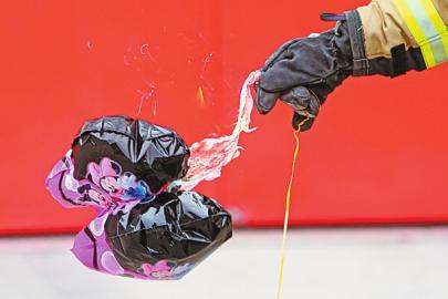 消防战士拿出一个“hello kitty”造型的气球固定在手中,另一名消防战士将点燃的废纸逐渐靠近气球表面。气球呼地一下被点燃,一团火焰从气球下方冲出,直扑消防员战士面部。同时伴随着“嘭”的声,十几秒时间内,火焰将气球烧得只剩残渣。记者看到,消防战士所戴的手套和衣服处留下了被烧焦的塑料皮。