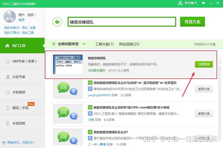 2. 然后在搜索中输入: “键盘按键故障”,单击“查找解决方案”,然后在相应的解决方案中单击“修复”.
