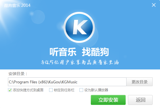 启动酷狗音乐2014安装程序之后,点击自定义安装可以进入下图界面对安装过程进行自定义设置;