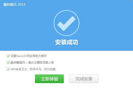 酷狗音乐2014安装完成之后,如上面界面所示,不需要的勾选插件取消选中即可。酷狗下载