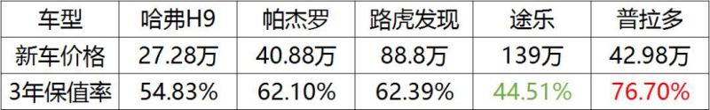 我们找了市面比较火热的越野车做了一下保值率对比:
