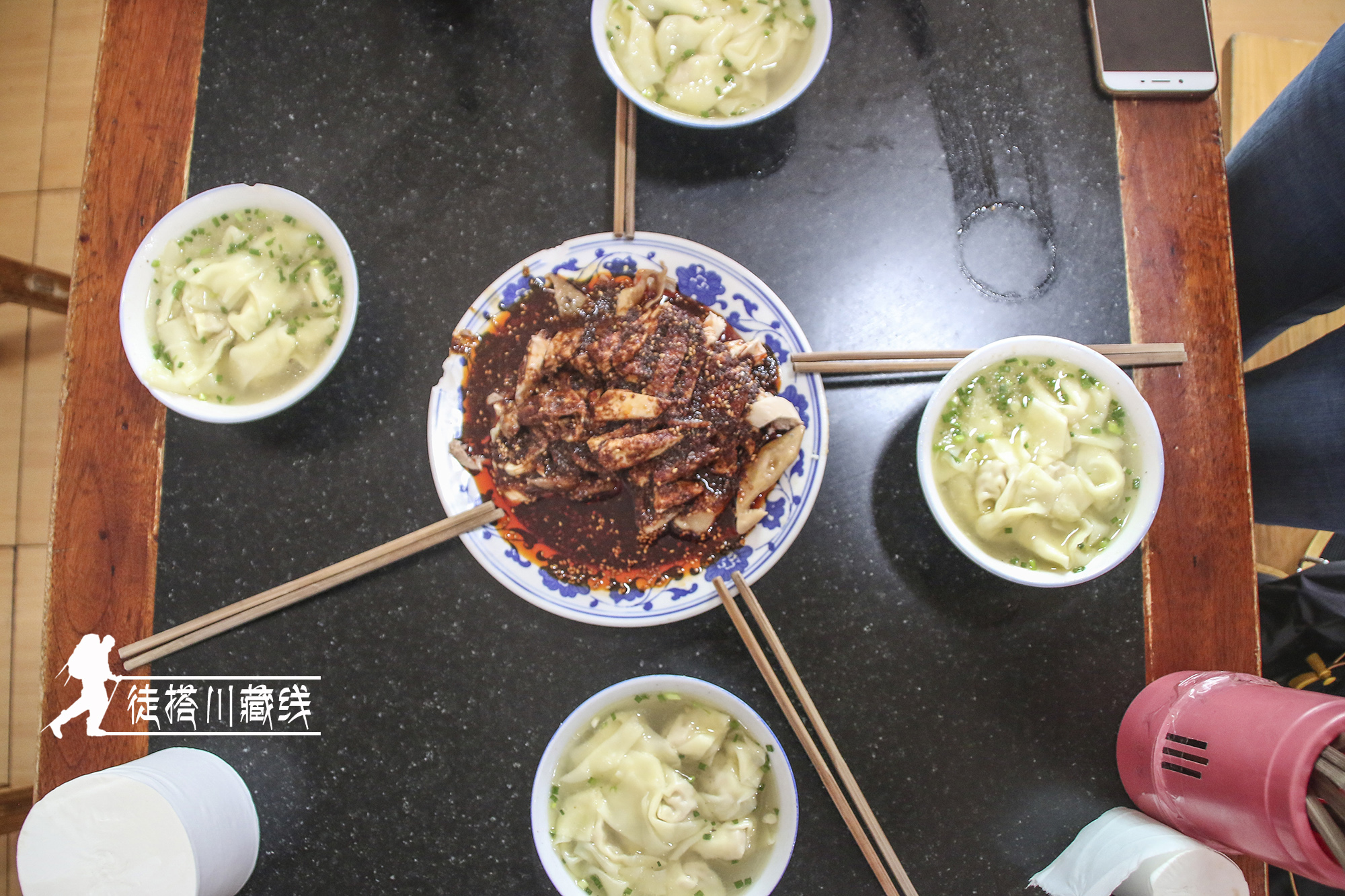 张大哥今天是从成都去康定,得知我们的目的地是拉萨,愿意今天把我们一起搭到康定,幸福来得太突然。到了雅安,下了成雅高速,张大哥并没有急着赶路,而是把我们带到一个小巷子里,他说这里有一家老店铺的凉拌鸡肉特别地道,想请我们吃。一斤鸡肉,一人一碗抄手,这就是我们徒搭之旅的第一顿饭,张大哥搭我们这么远,怎能让他破费请我们,最后我们买了单。
