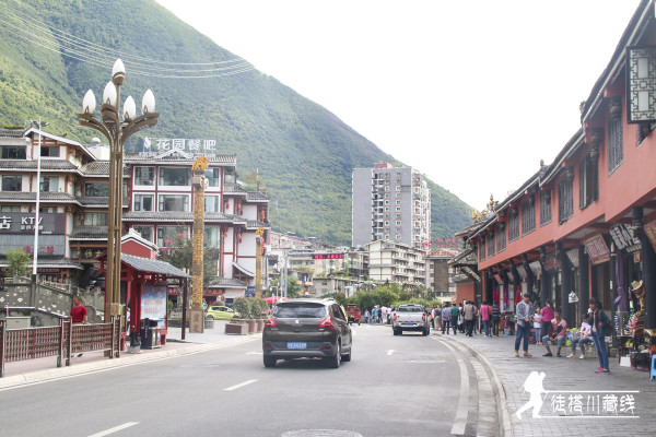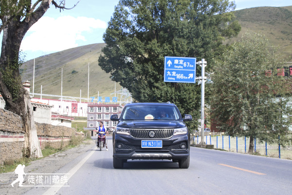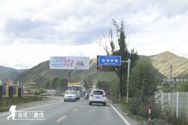 到了318国道和215省道的三岔路口瓦泽村,老乡把我们放下,导航上显示距离我们今天的目的地新都桥镇还有7公里,决定徒步过去,大概一个半小时就能到。由于已经进入新都桥的范围,318公路两旁都非常漂亮。当我们拍照正起劲的时候,一辆当地的SUV主动停在我们身边,车主是一位老大爷,示意我们上车。原来他是要去新都桥镇上买东西,顺便把我们带过去。人家主动停车,我们怎好拒绝,