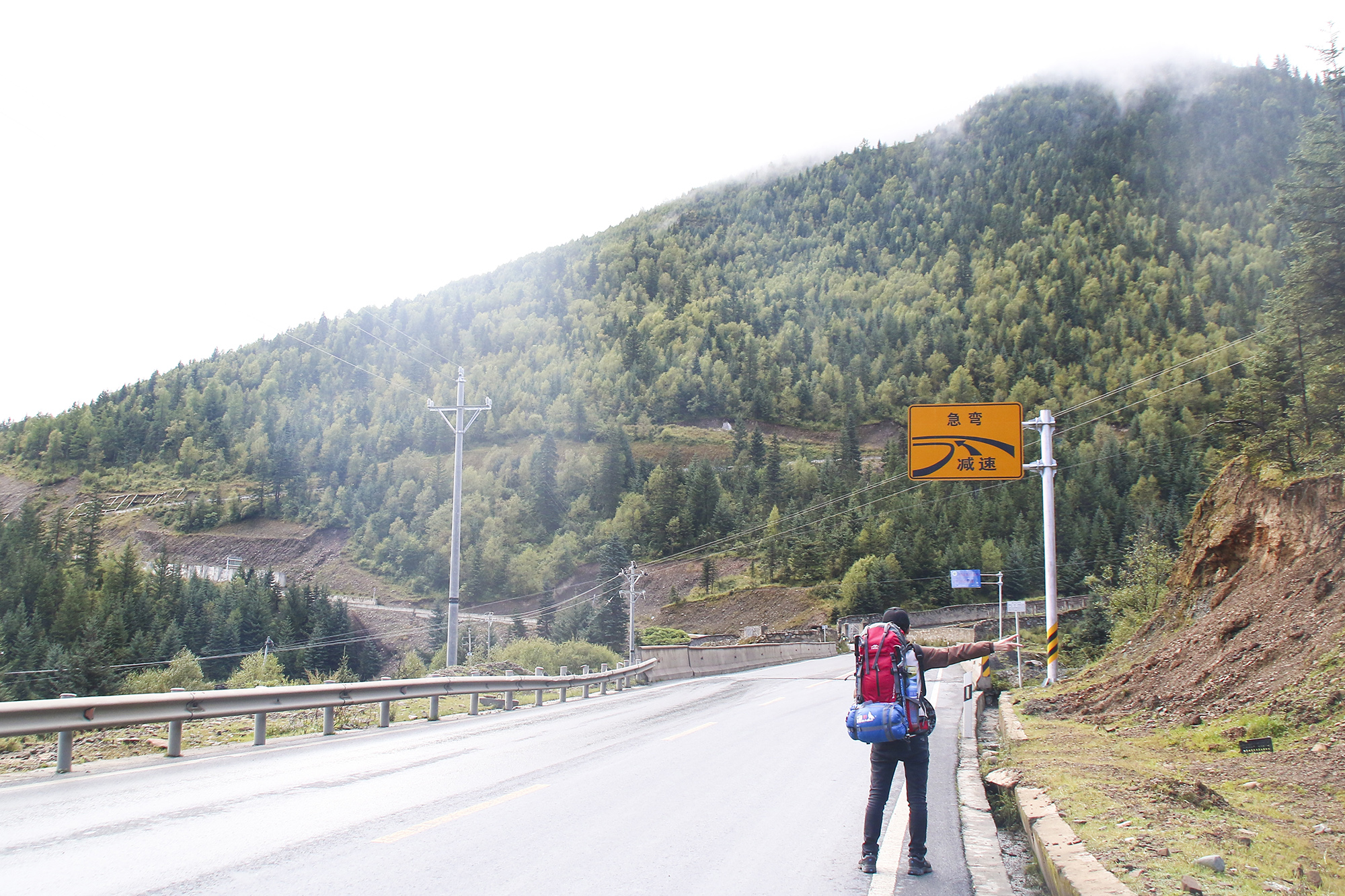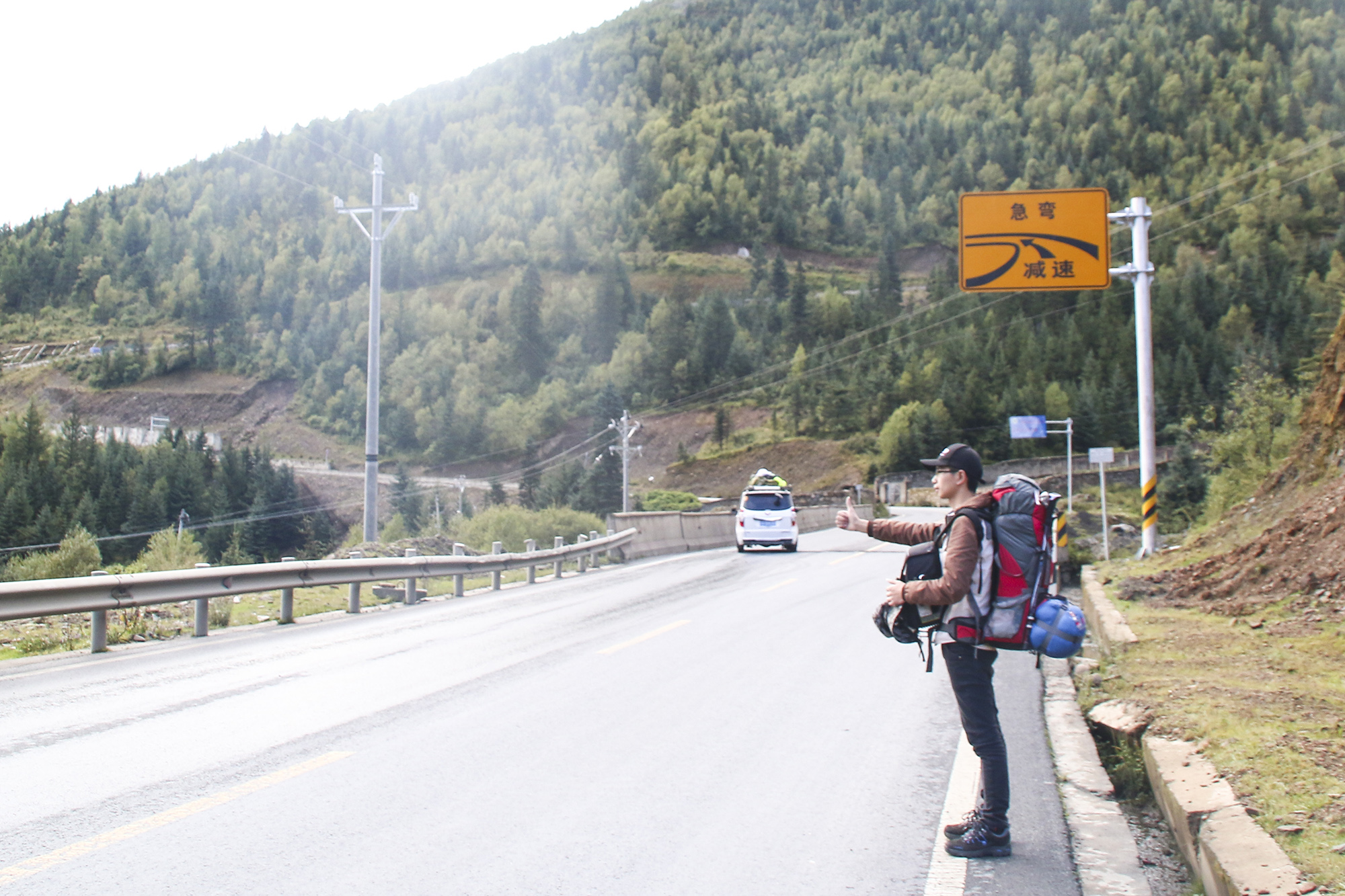 背着36斤的背包连续上坡太消耗体力,在一段稍缓的公路边尝试搭车。