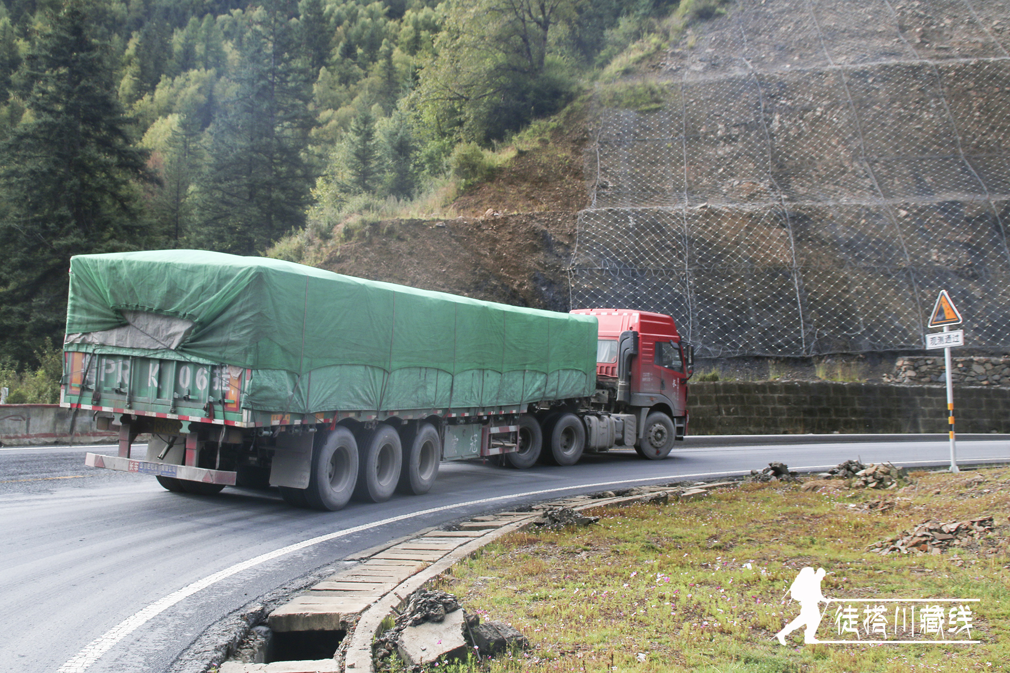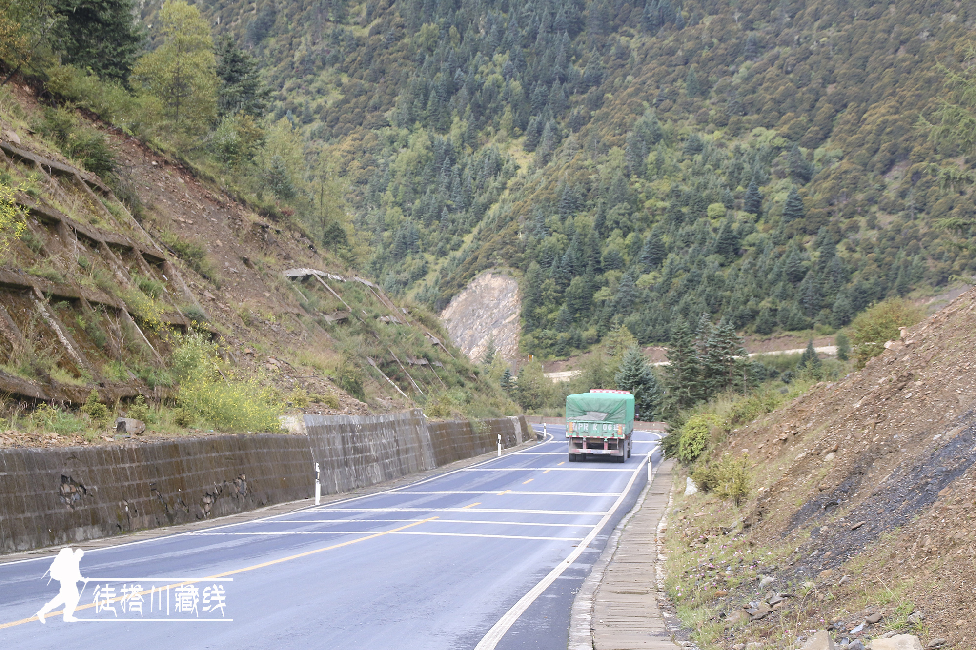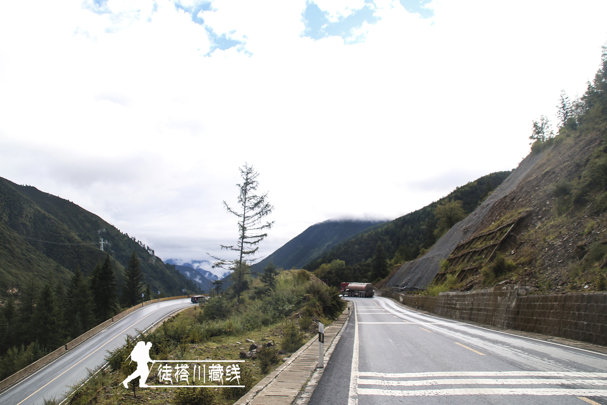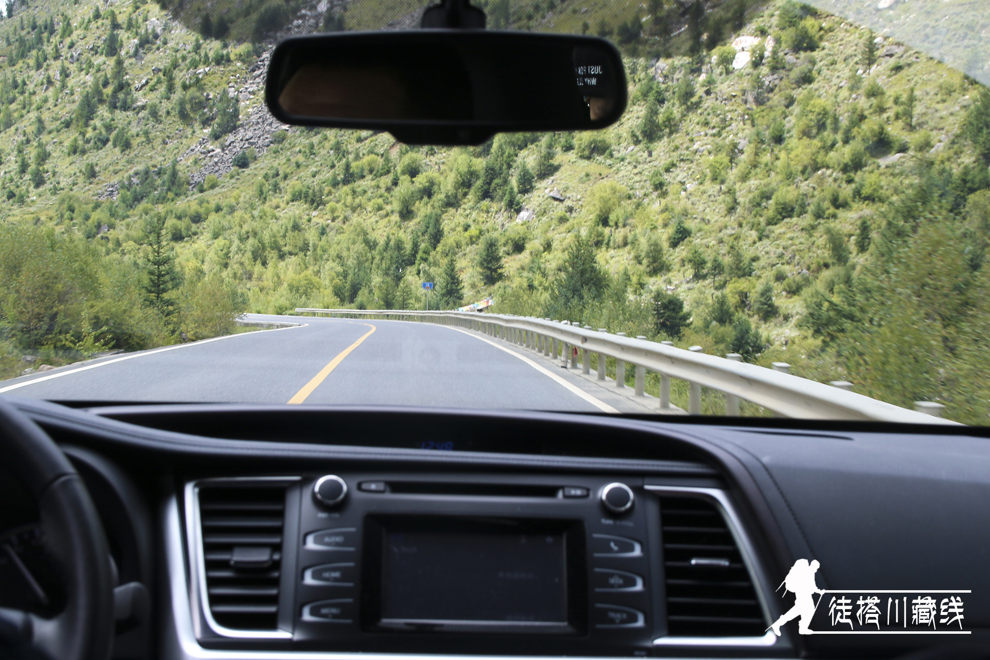 本以为没有背登山包,去塔公草原不好搭车,结果还是搭上了。先是搭车到了318国道和215省道的岔路口,去塔公草原要离开国道走省道,从这里去塔公的车非常少,连大货车都没有,向前走了一段路,一辆成都牌照的车停了下来,正好他们也是去塔公草原玩的,就捎上我们。聊天之后才发现他们一个是北京的,一个是甘肃的大哥,这几年都在雅江做工程,今天去塔公草原看看。一路上给我们讲,他们在雅江干的工程有多大,百亿级别的。让我们下午跟他们去看看,一般人还进不去。