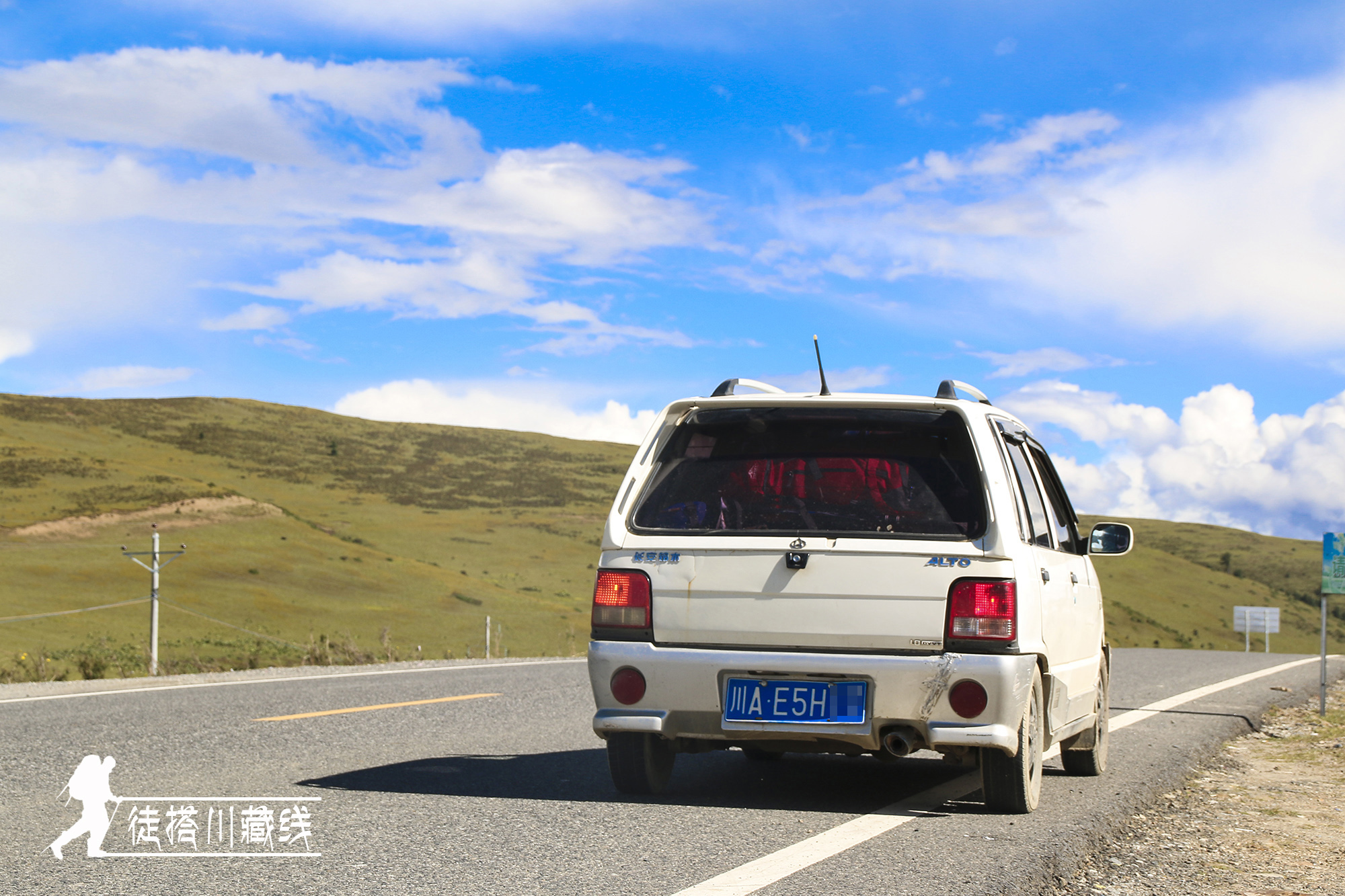 10分钟过去了,30分钟过去了,60分钟过去了……我说:我们还是走吧。走了不知道多久终于一辆像报废了的奥拓车停了下来,车主是一位年龄较大的藏族大爷。得知我们是去稻城,愿意搭我们去前面的村子。虽然这辆车的速度和条件都有限,但是当地人的热情朴实和和蔼善良给我留下了深刻的印象。藏族大爷说话我们听不太懂,他说了几次他的名字,但是我还是只能听懂第一个字“桑”,旅行的魅力就在于我们会不经意收获很多善意。