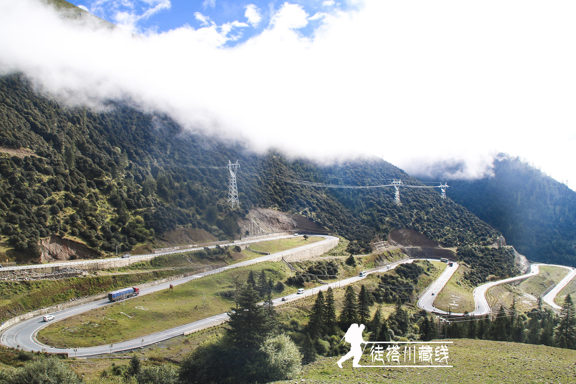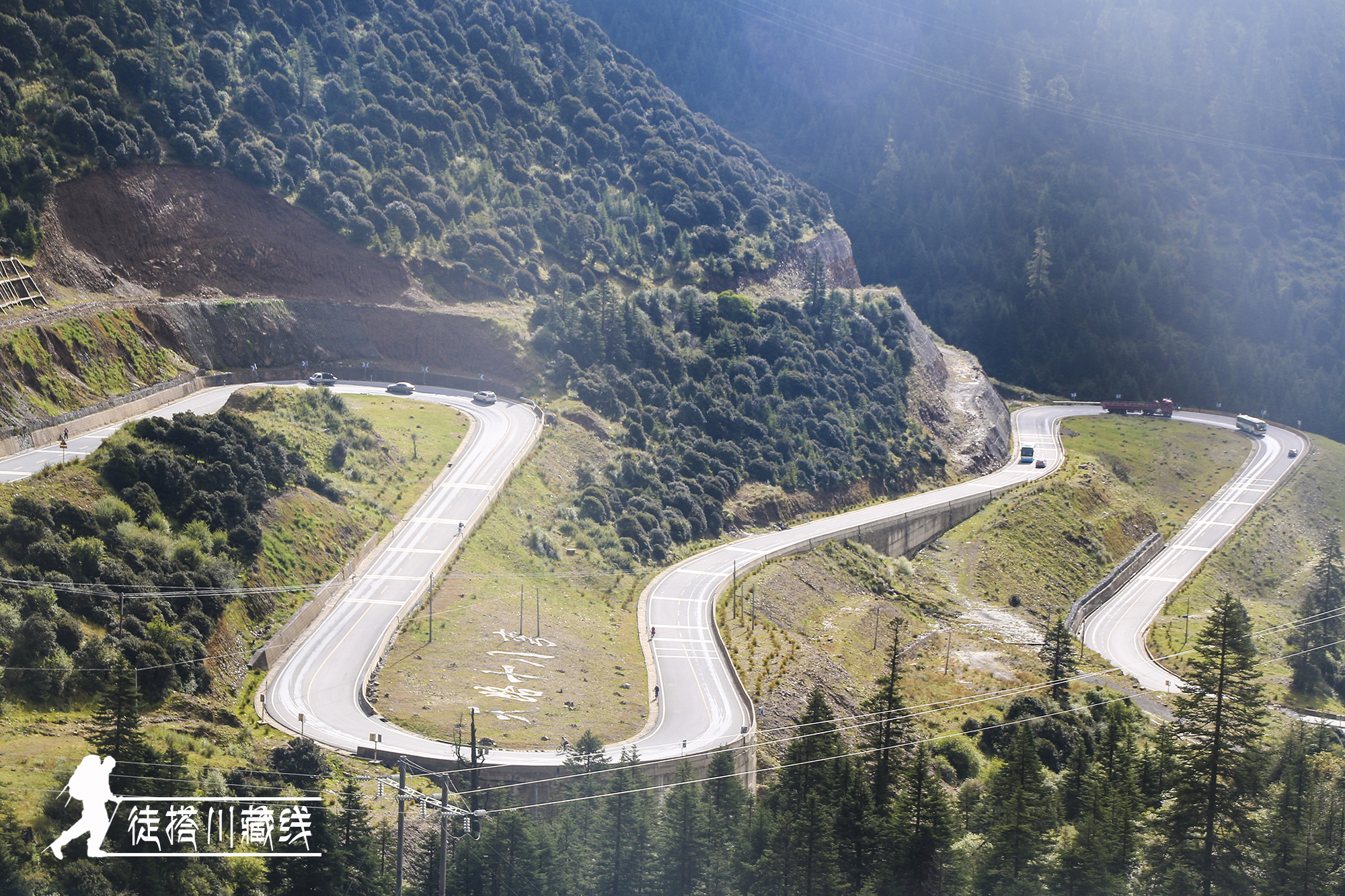 天路十八弯,10多公路的盘山公路,将海拔从两千多米提升到四千多米。从半山腰俯瞰刚刚走过的公路,曲折如胳膊肘弯,有一种震撼的曲线美。