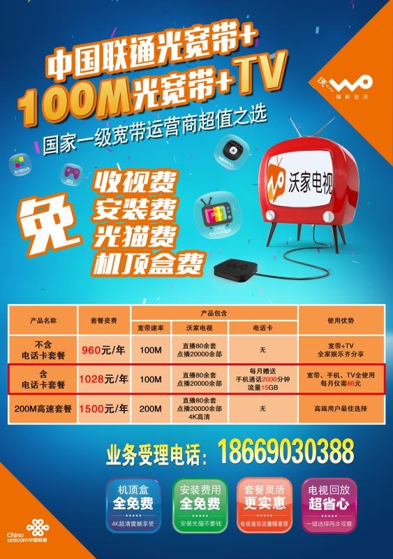 现在最新的100M特惠一年960元,折合每月只要80元就可以享受100M光宽带,包括100M光宽带一年使用费,电视直播点播一年收视费,初装费、光猫、机顶盒,加68元(每月6元不到),每月送手机每月2000分钟通话,15GB流量免费用,宽带、电视、手机全都用了!