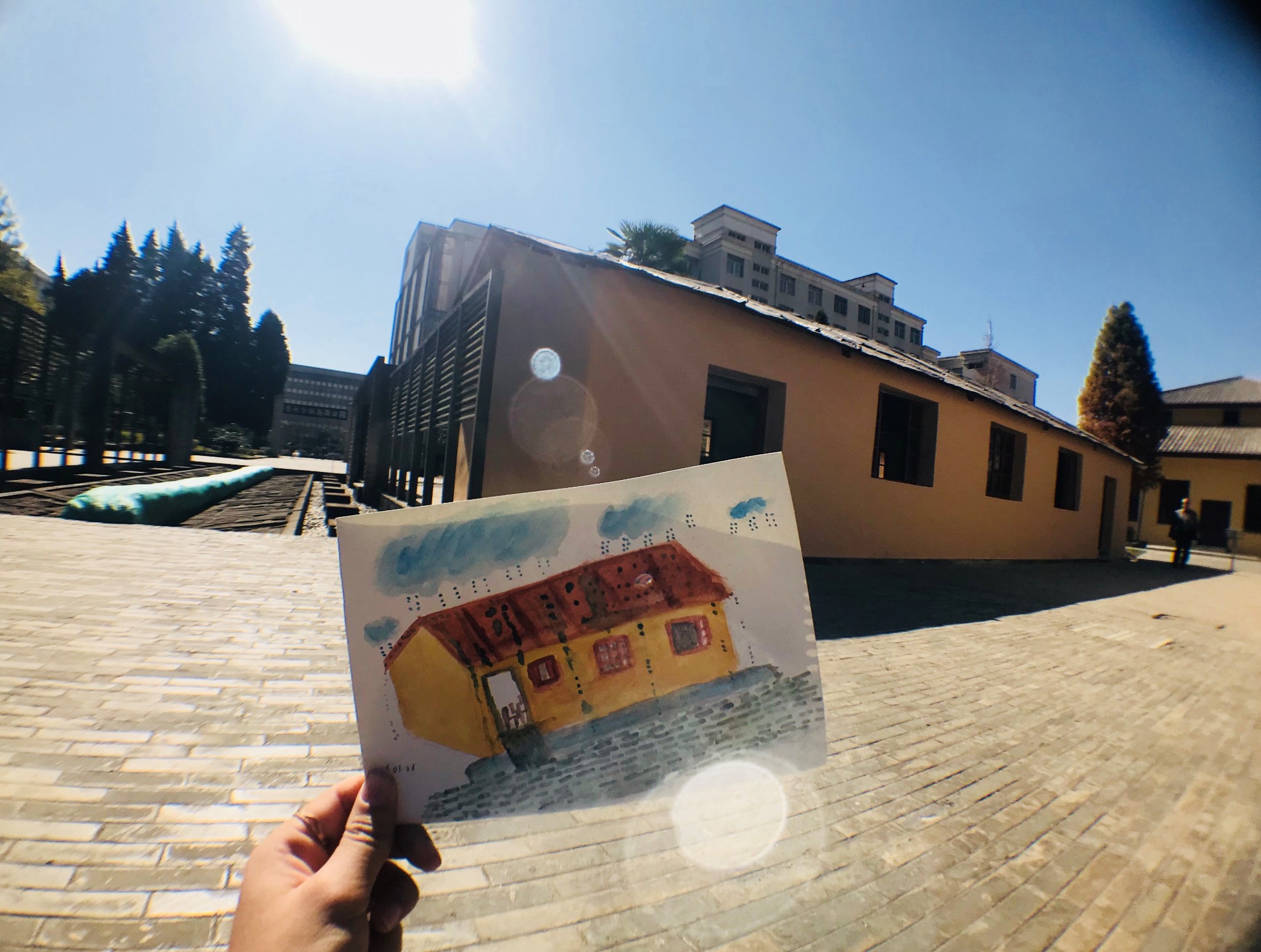昆明的阳光照在身上很热和,但是走进遮阴处,就有点凉意。我本来想在校舍内一边感受一边画,可惜里面阴冷,于是我就坐在外面的青石板上,面对面地画。当时,我的背后就是联大博物馆、一二一运动纪念馆和烈士衣冠冢。一二·一运动是解放战争时期一次的反内战、争民主的学生爱国民主运动,1945年发生于云南昆明。穿着校服的学生就在那里集合。我铺了一张纸就坐在地上,开始用仅有的一只自来水笔画我的固体水彩画。学生集合完后三三两两地从我身边经过,我感受到了她们好奇的眼神