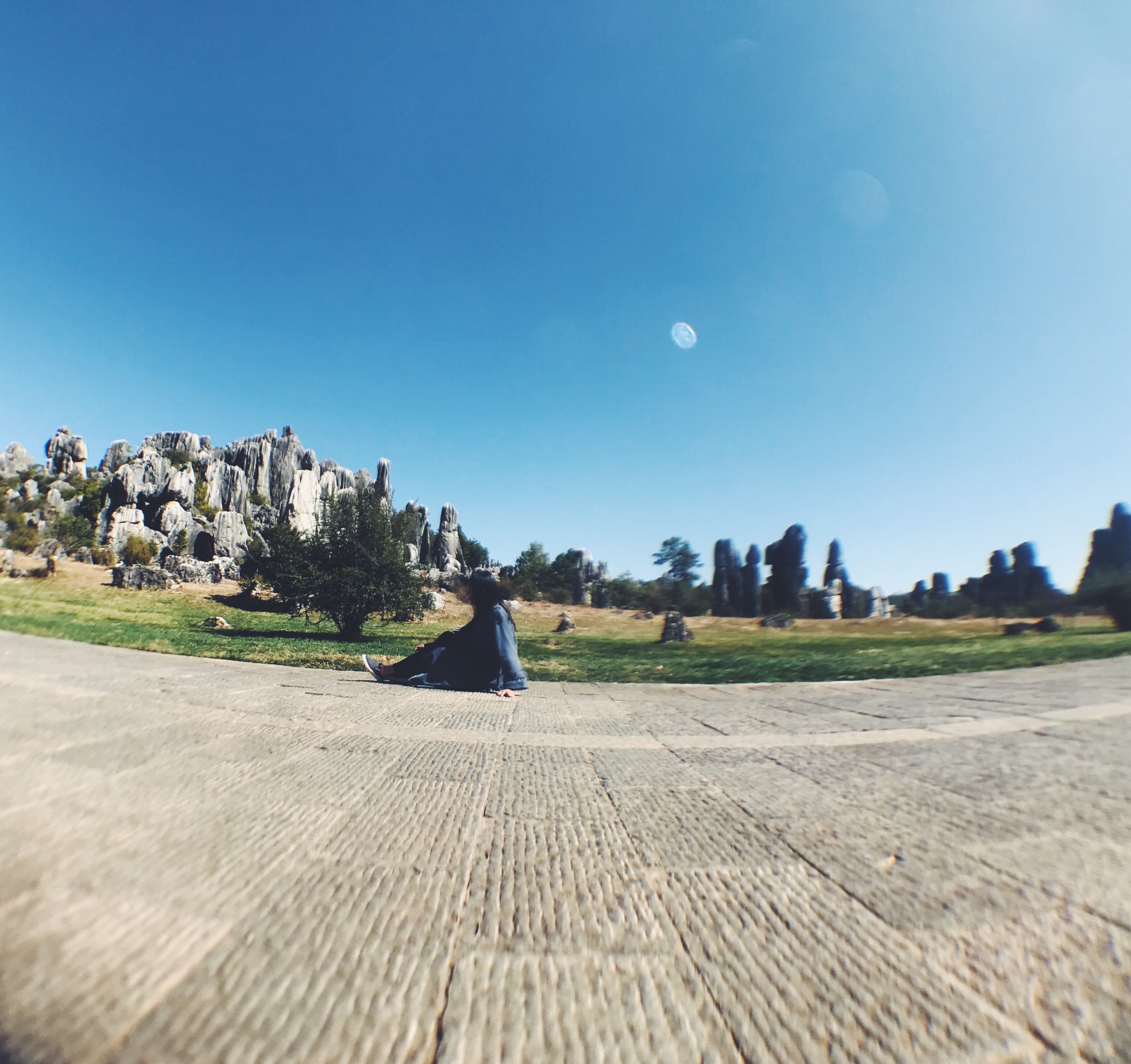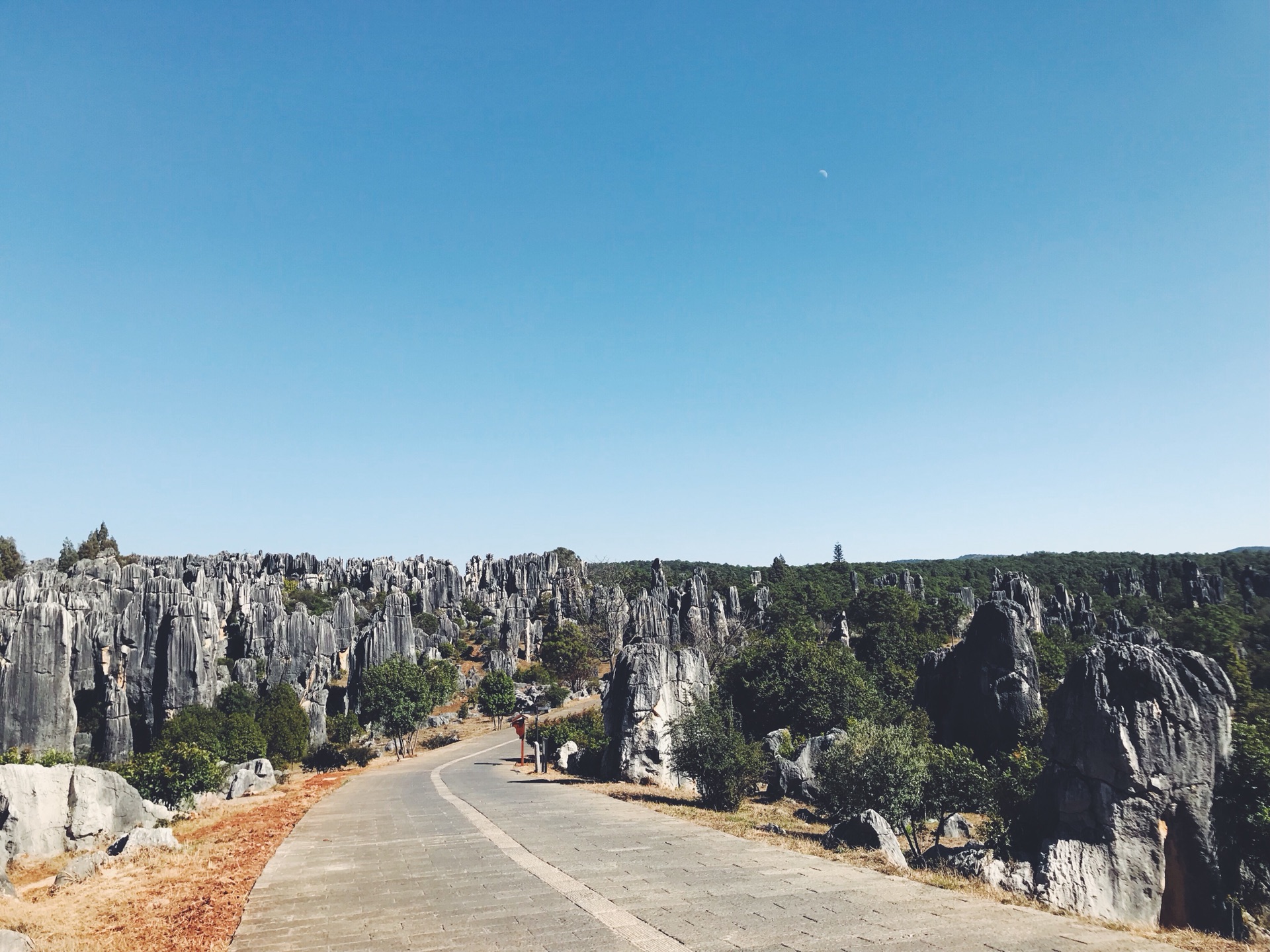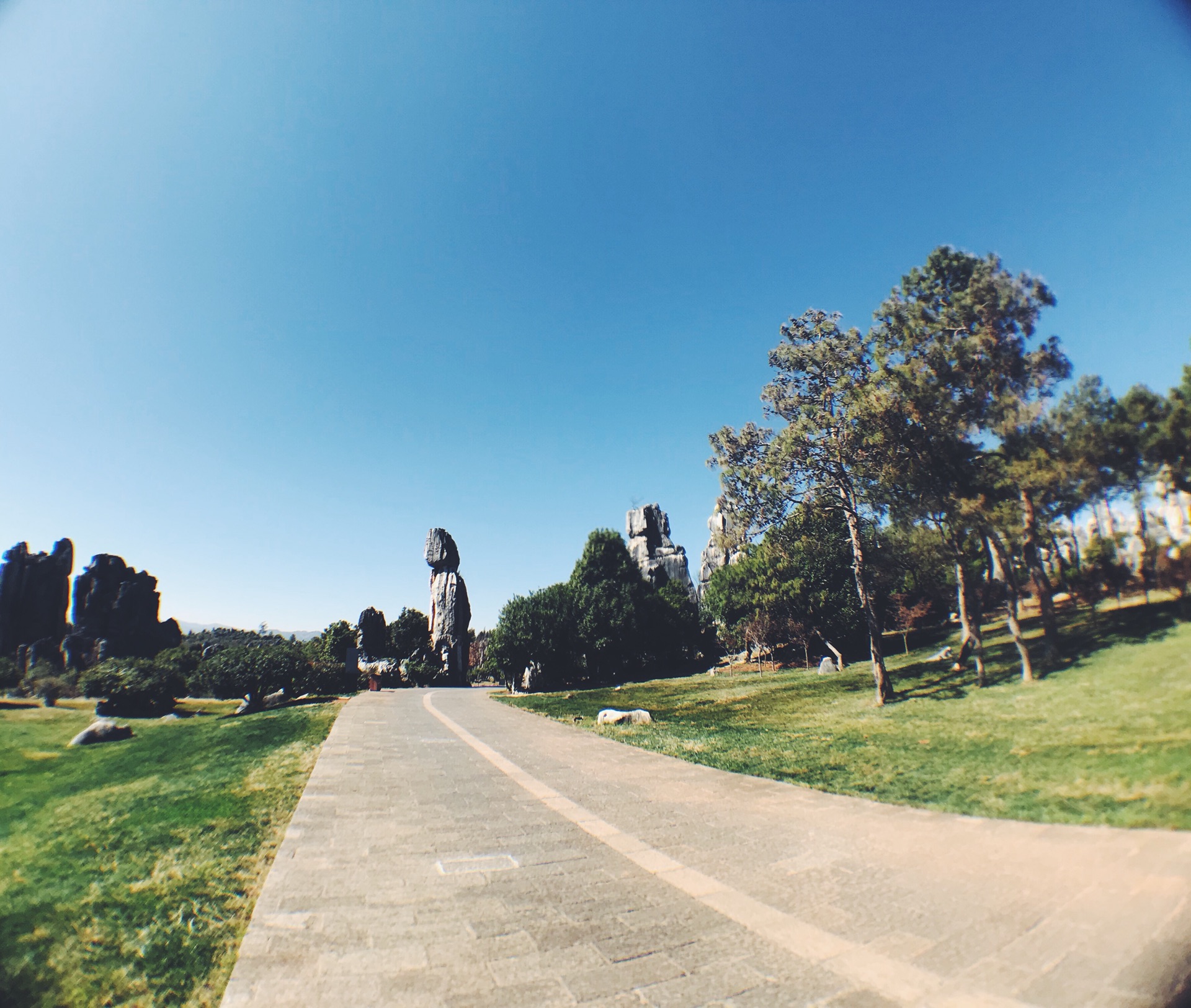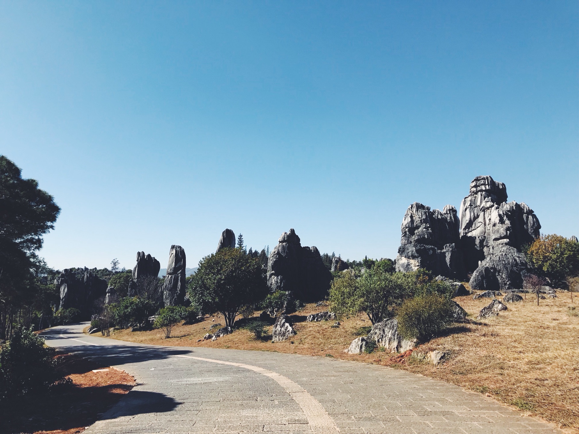 偶然间穿过一条小径,眼前顿时豁然开朗,和桃花源记里的场景相似。一条游览车道将两侧景分开。我当时想了一下,这条道应该是从景区进来右转往小石林的反方向开的。