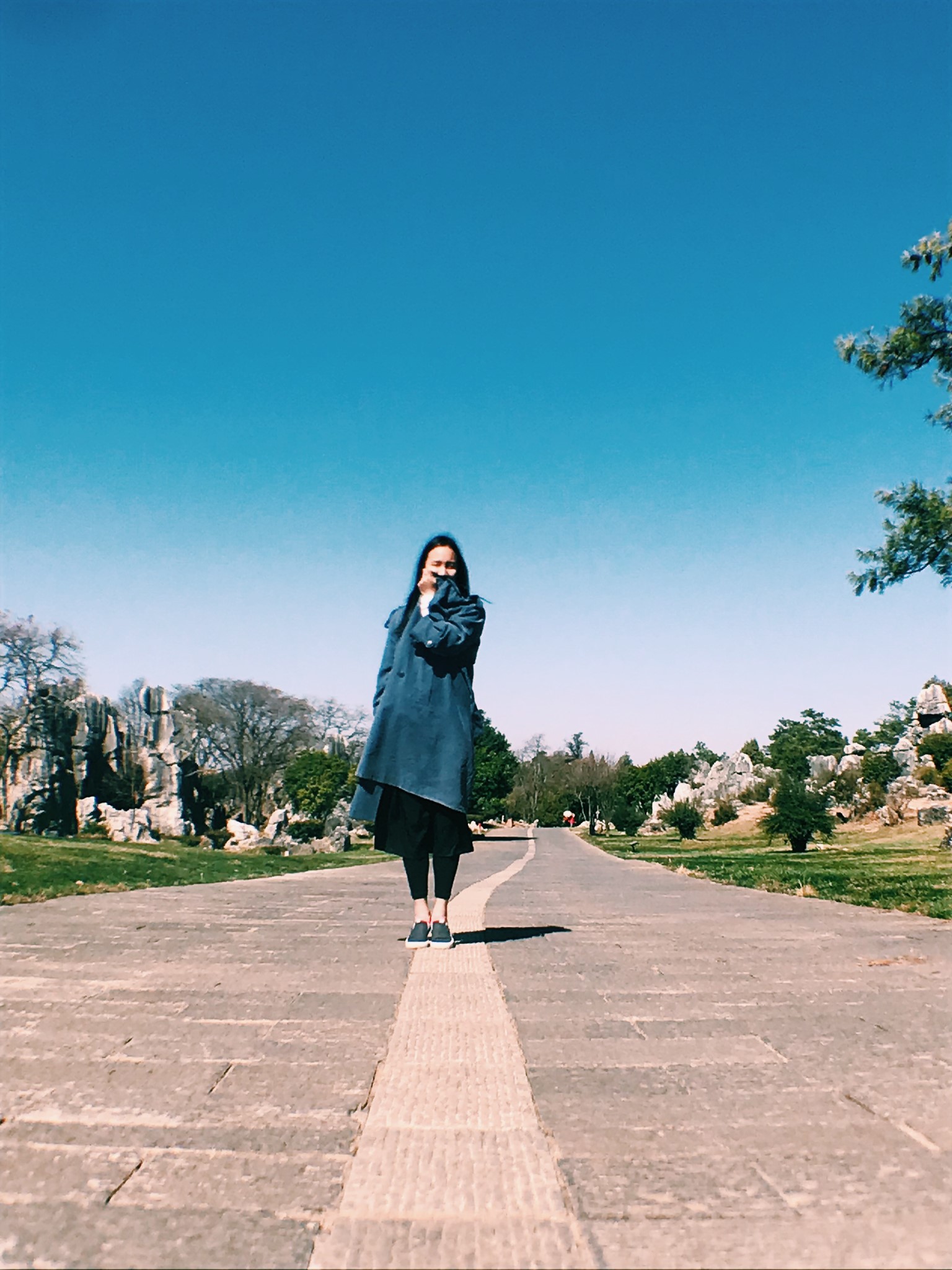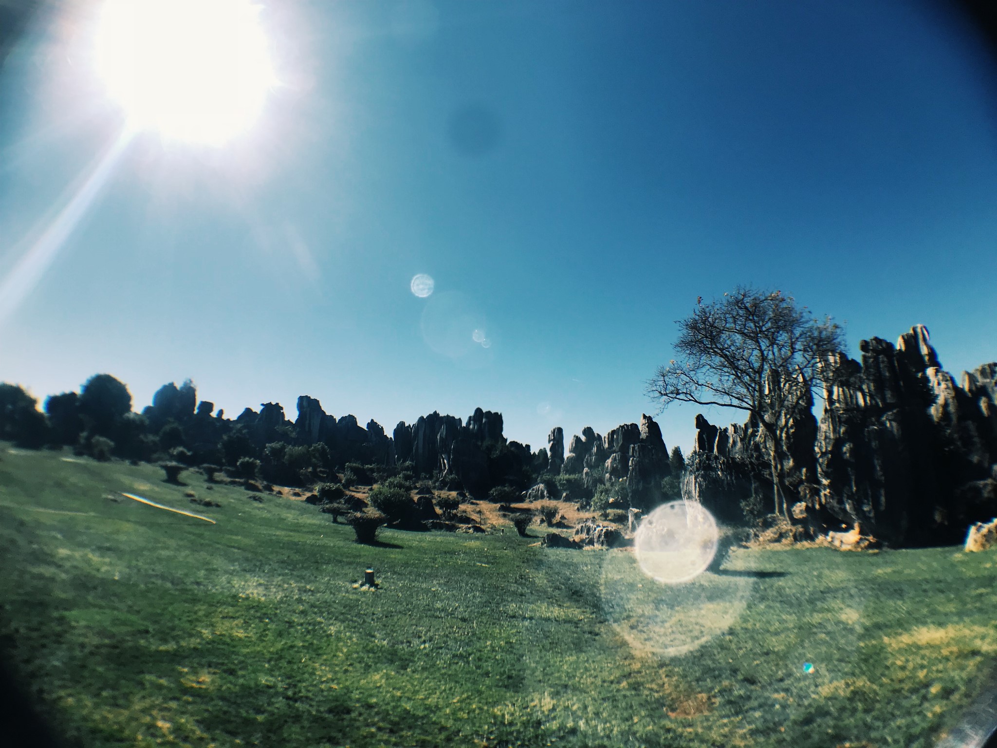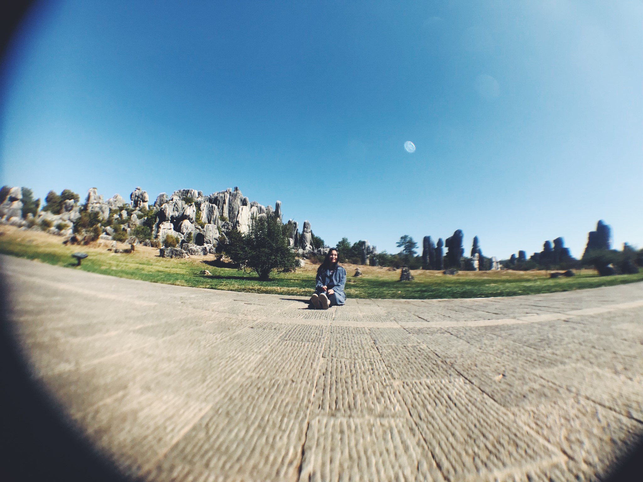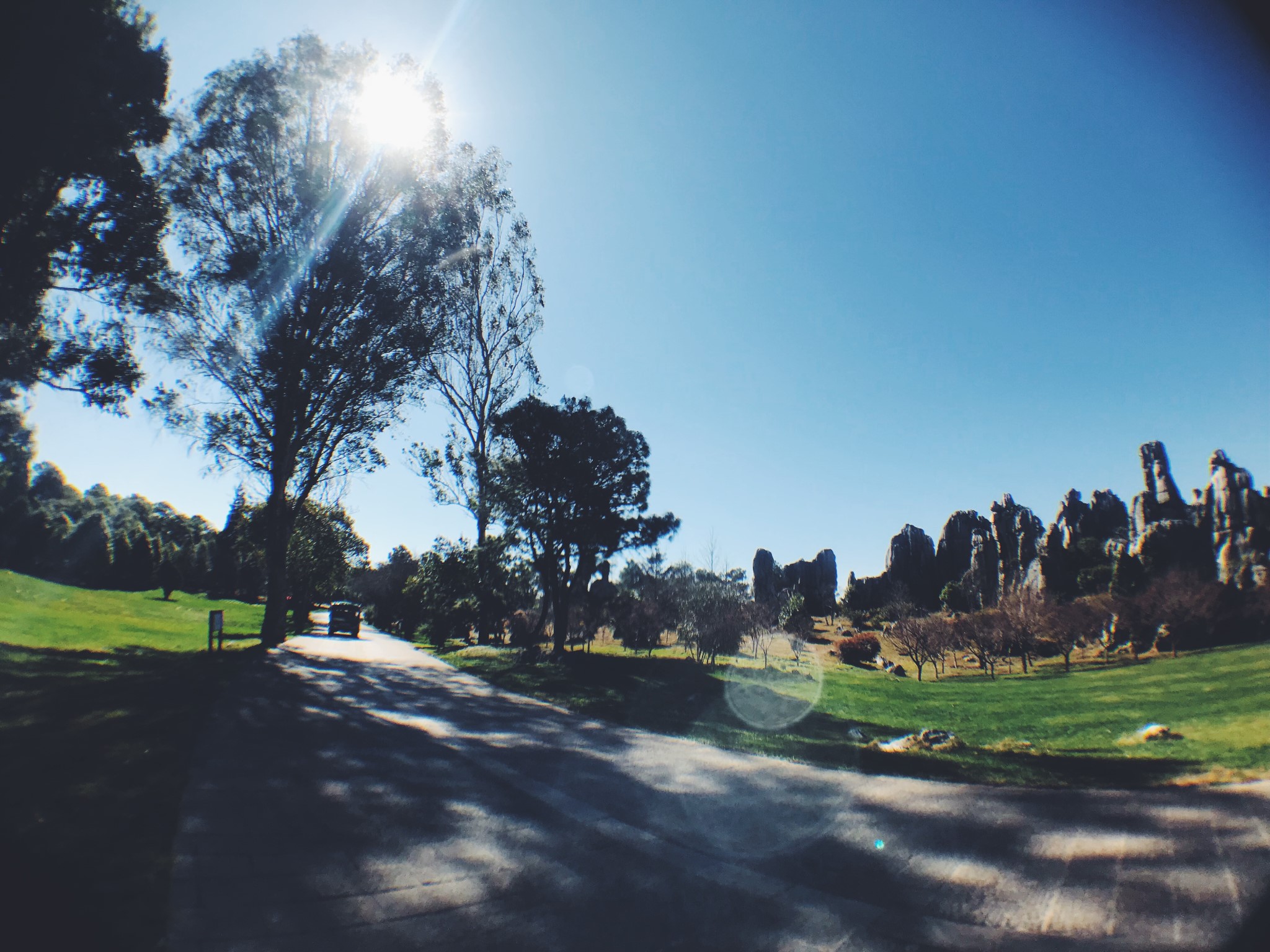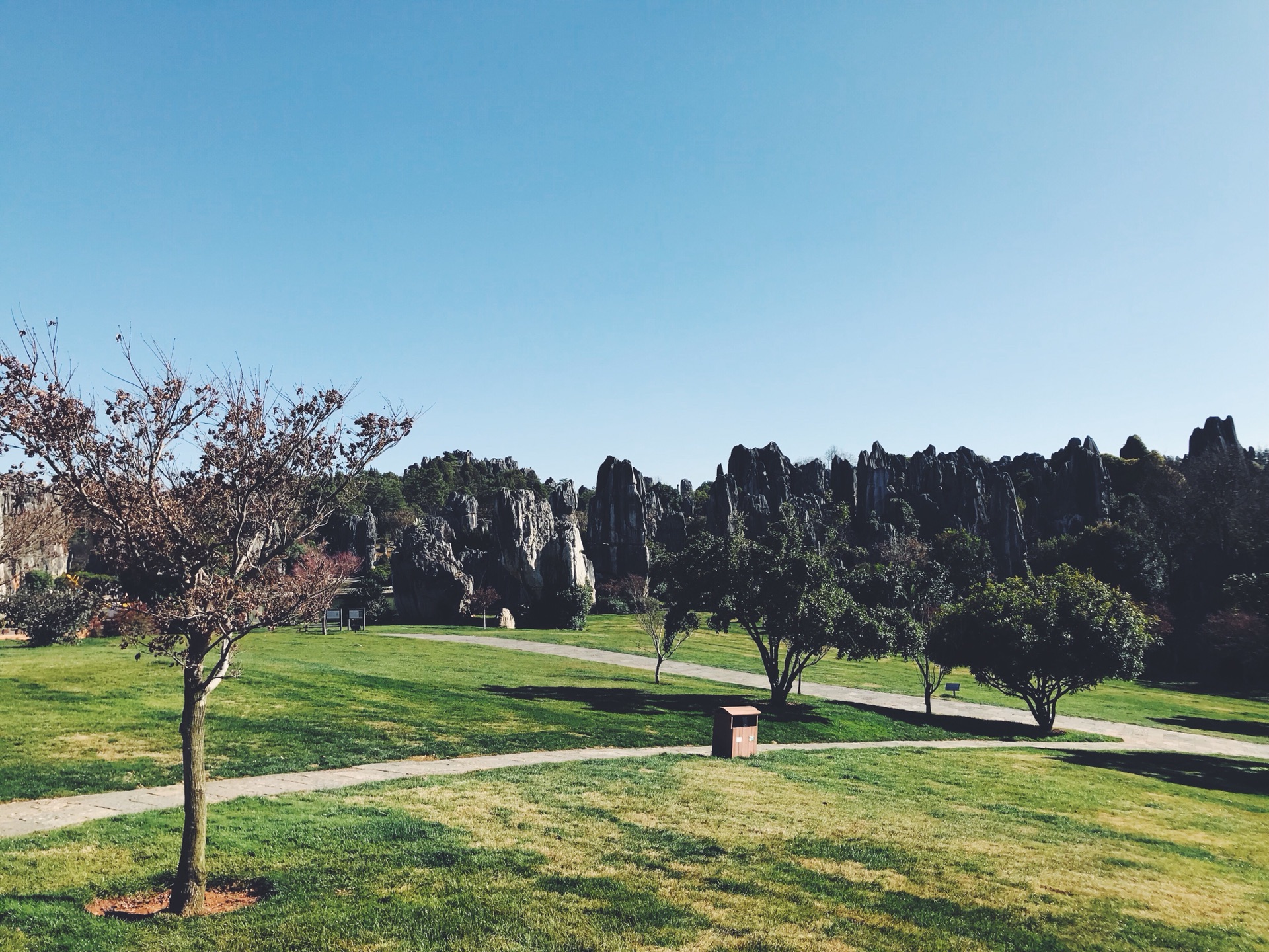 偶然间穿过一条小径,眼前顿时豁然开朗,和桃花源记里的场景相似。一条游览车道将两侧景分开。我当时想了一下,这条道应该是从景区进来右转往小石林的反方向开的。