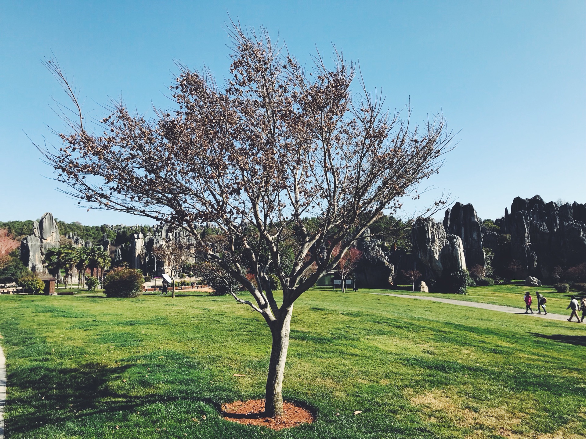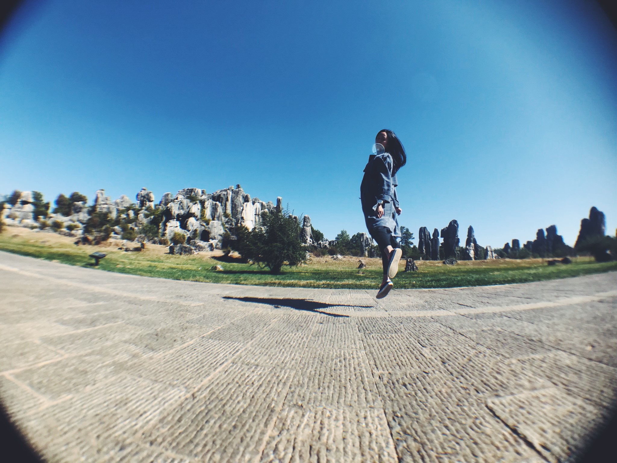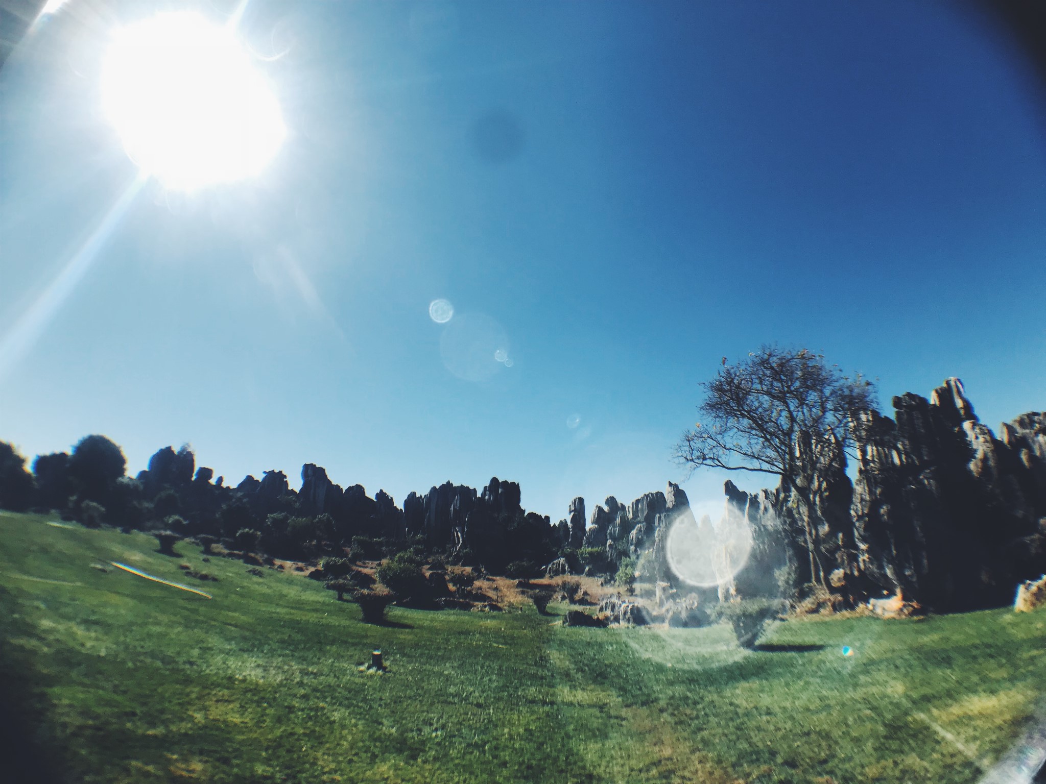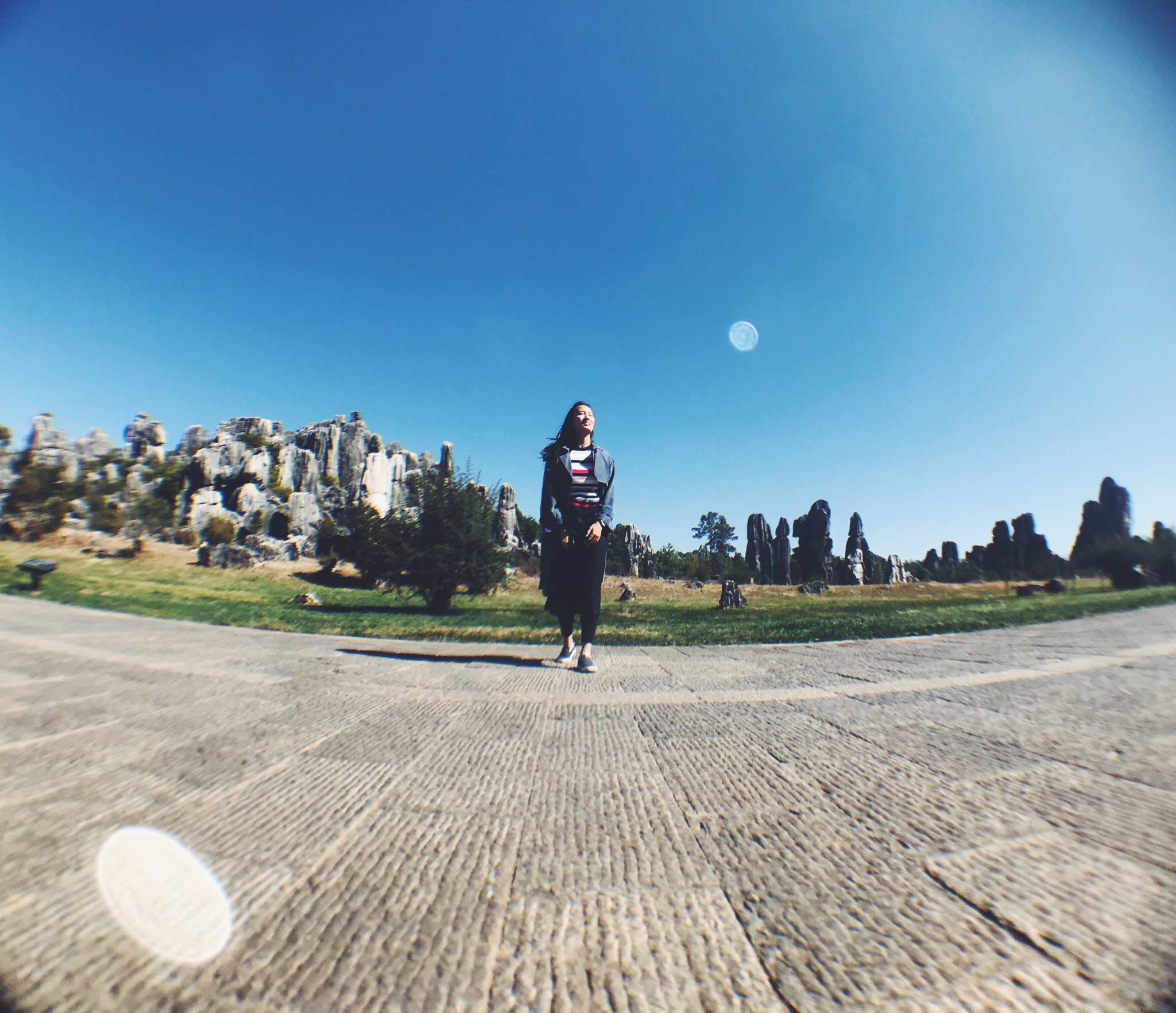偶然间穿过一条小径,眼前顿时豁然开朗,和桃花源记里的场景相似。一条游览车道将两侧景分开。我当时想了一下,这条道应该是从景区进来右转往小石林的反方向开的。