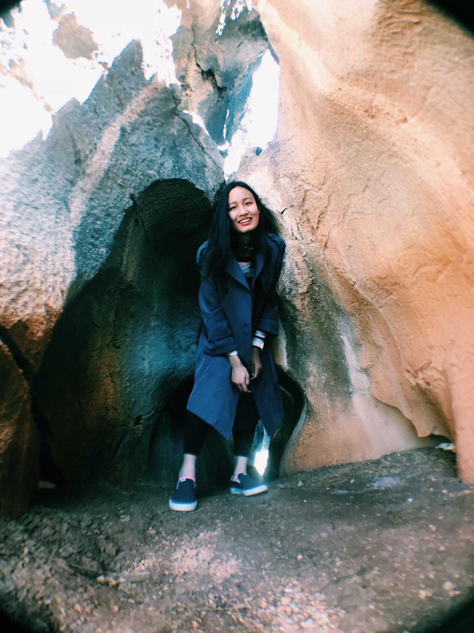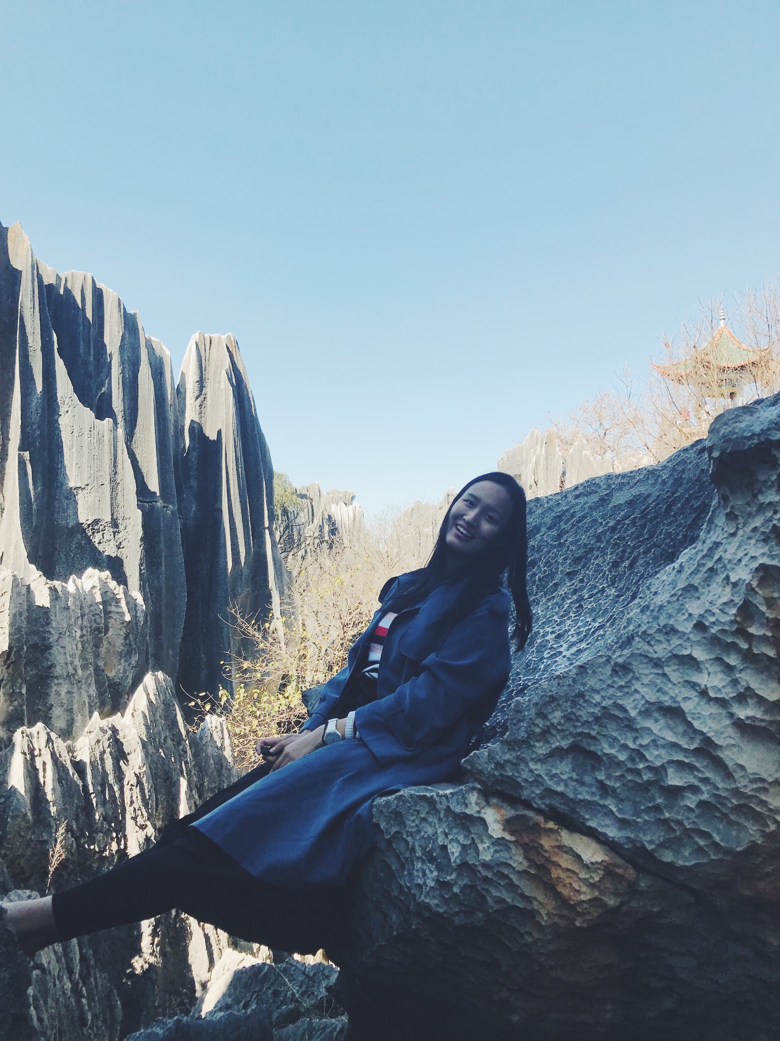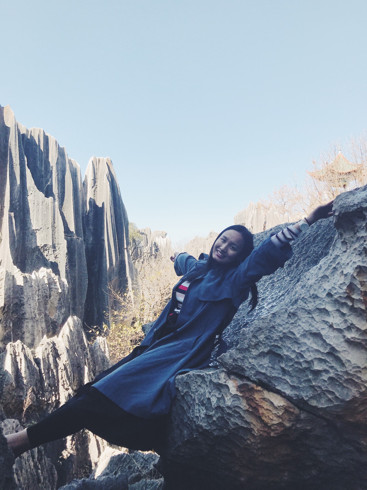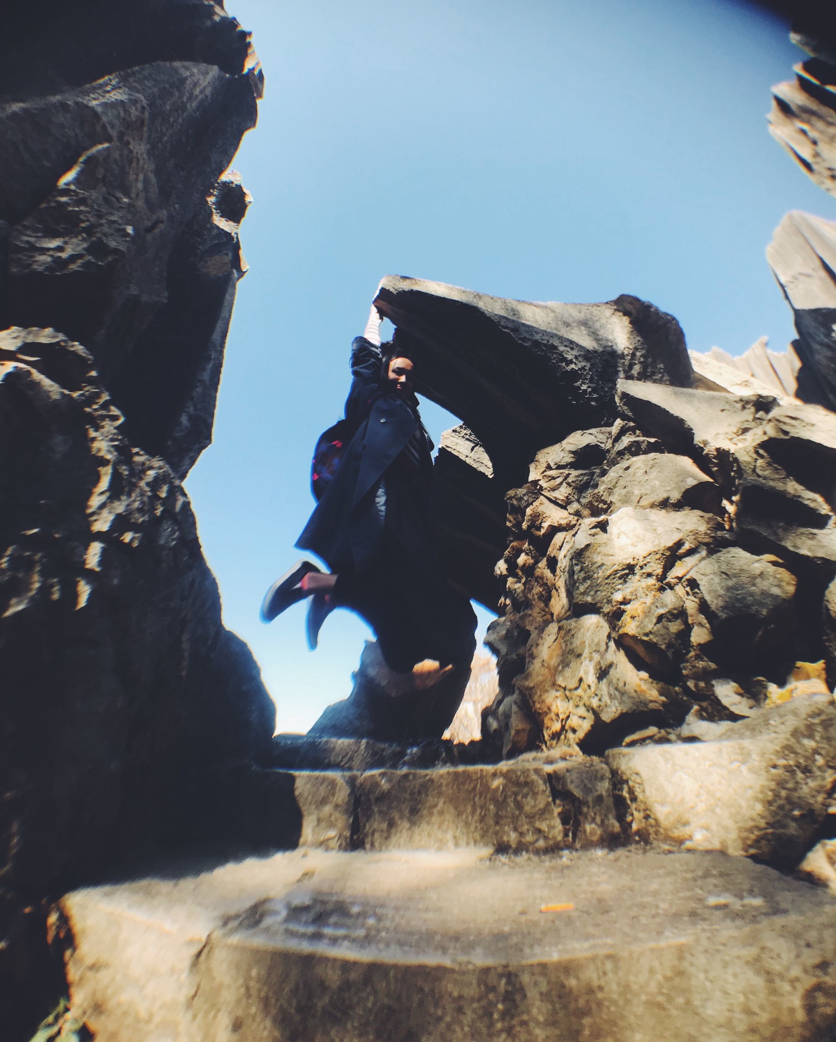 拍这组照片时,我坐在一处凹面石头上,经过常年的雨打风吹,它的表面已经被打磨得十分光滑了,碰巧我的外套,也是滑滑的,于是当时拍照的我,内心是非常紧张的,嘴角挤出的微笑都隐隐约约带着一丝惶恐。这块突出的石头离台阶还有一定的距离,我脚垂下去都踩不到地面。好在,偶尔冒险一下,回馈都还不错。