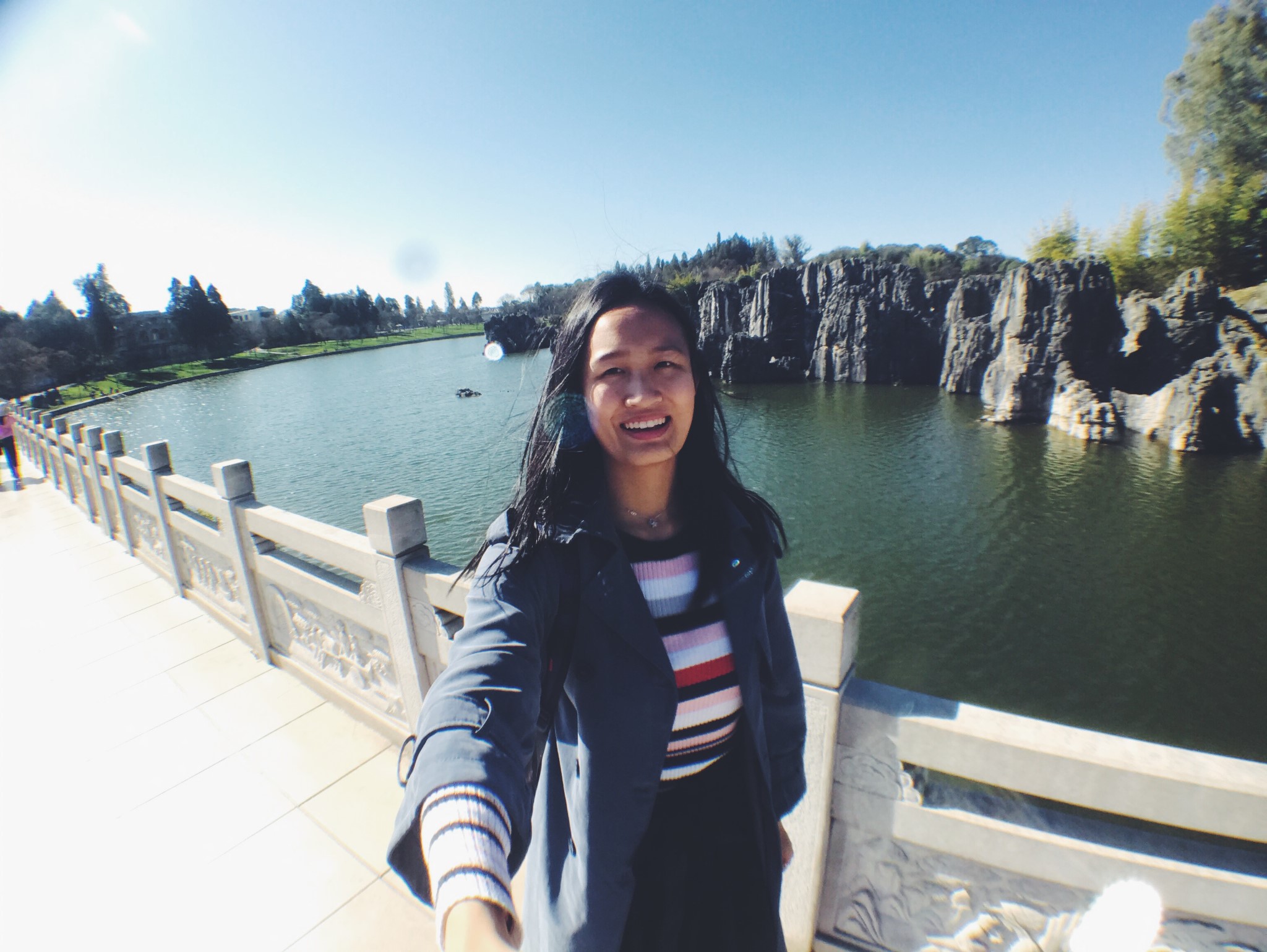 石林好像名声不仅仅在国内很大,他还吸引了许多亚洲和欧美国家游客。景区配有英语解说的导游。跟我同一时间进园的就有一波巾,脸上化着淡妆,伸长自拍杆,开心的与石林合影。