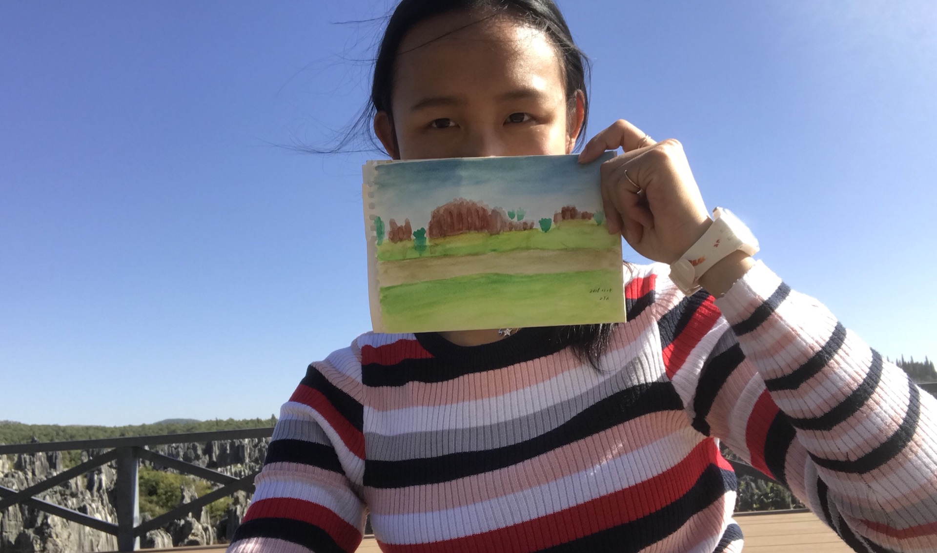 观景台上风大,阳光也强,画着画着就把头发吹起来遮住眼睛,脖子也被晒热了