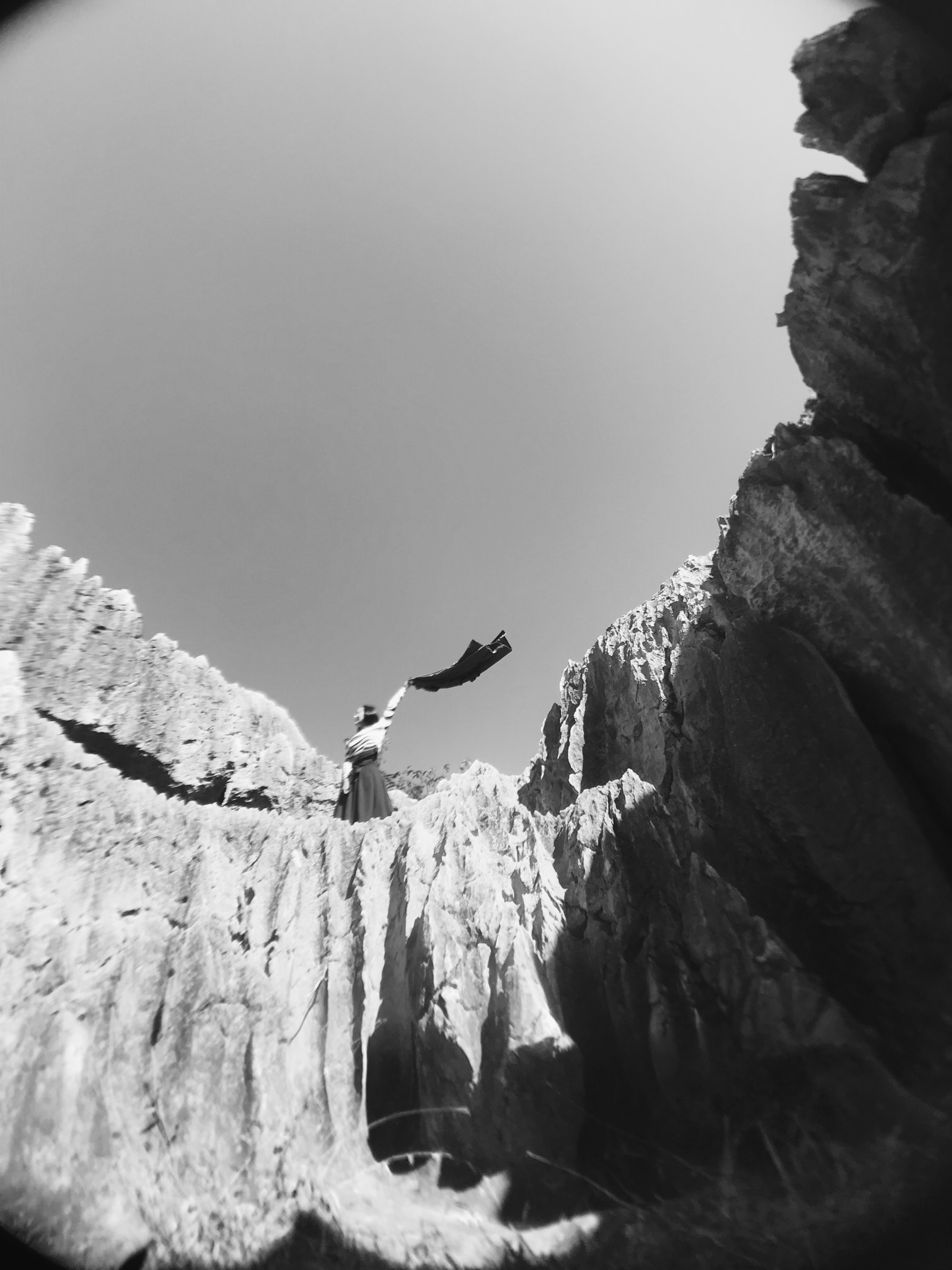 走在我前面的一路人在这里拍了照,也让我留意到这块悬在高处的石头,又把三脚架放在地上拍下了这张照片。藏在手里,跳下来的时候手也被锋利的石头勒出了口子。