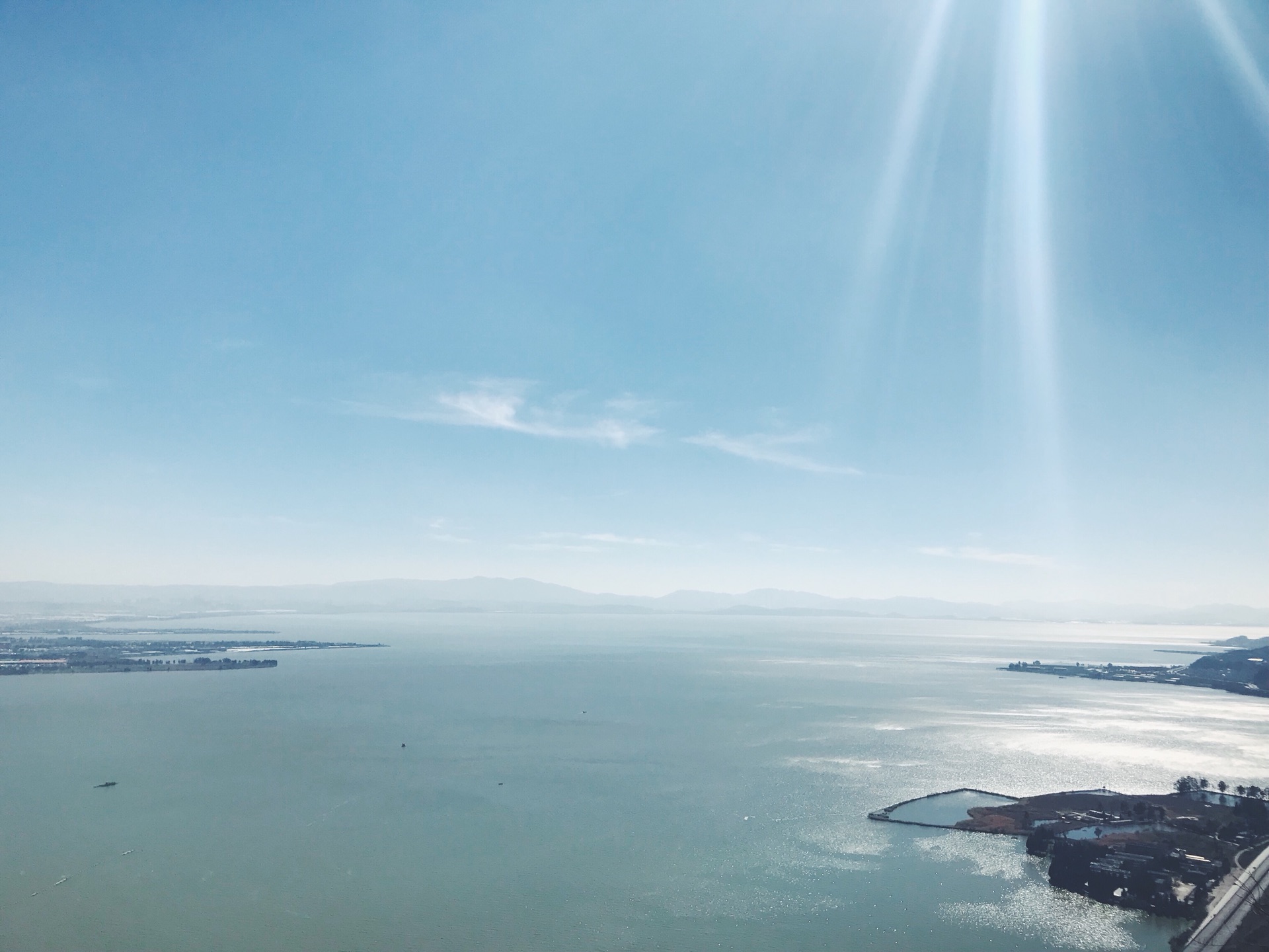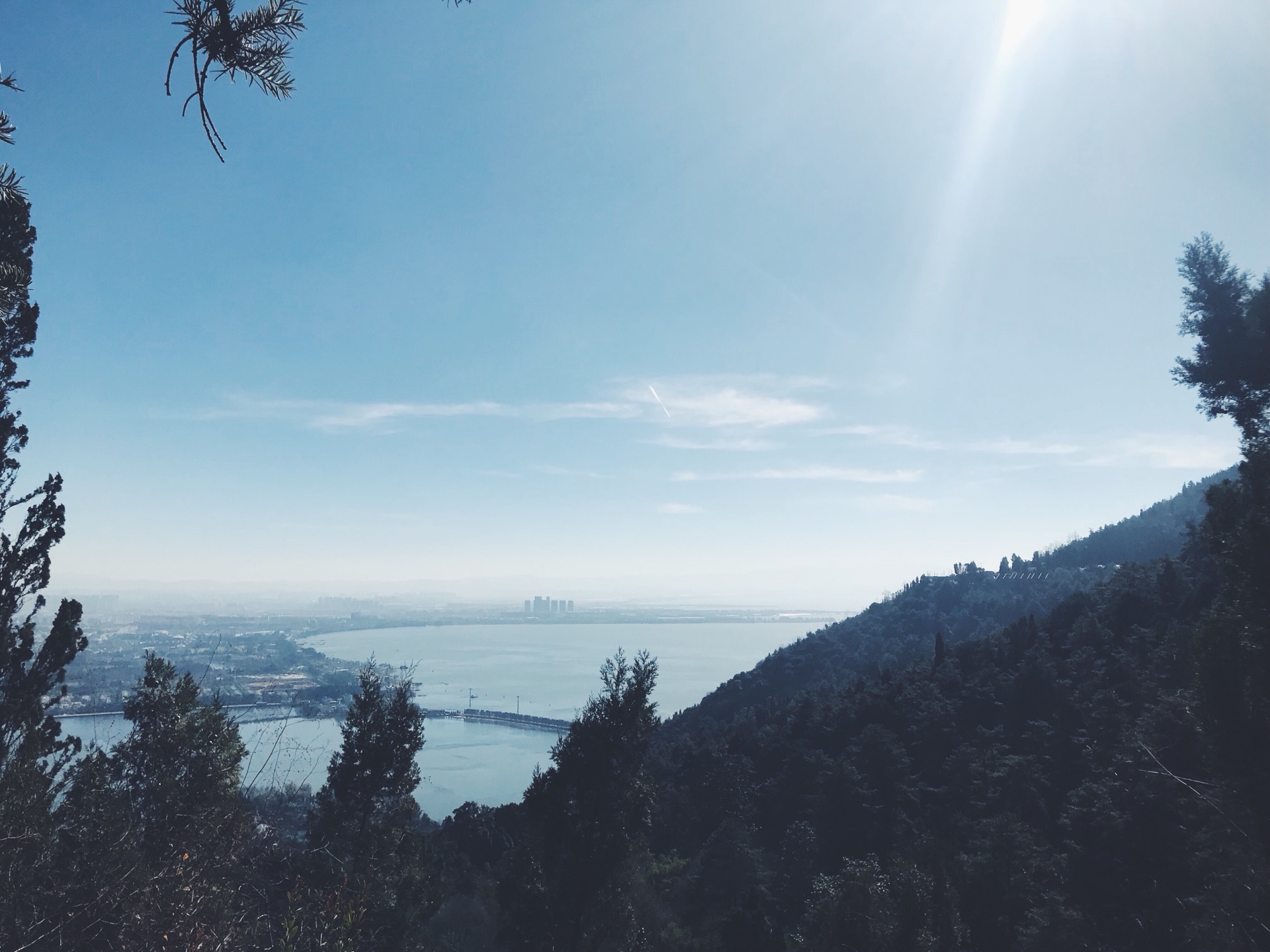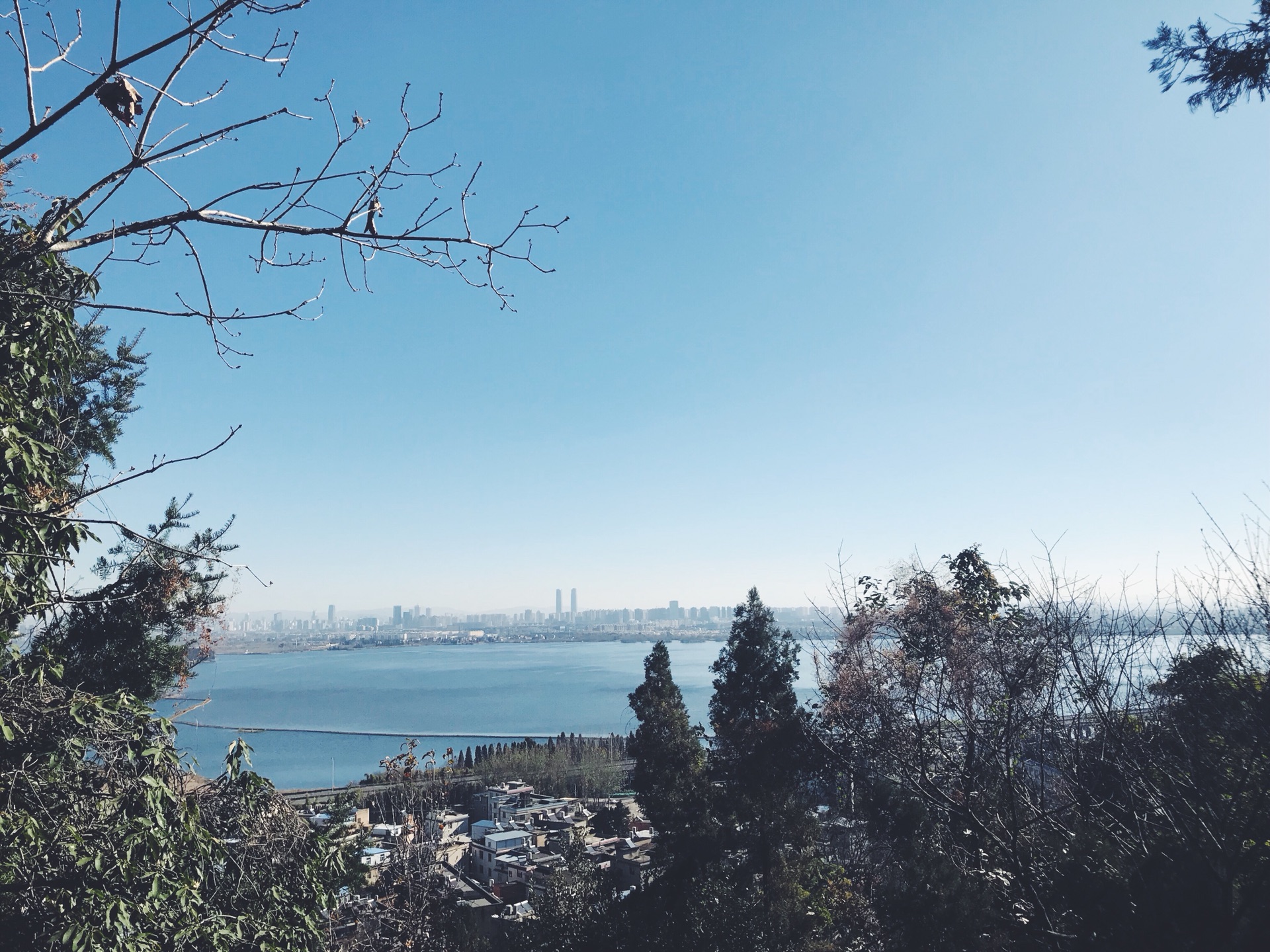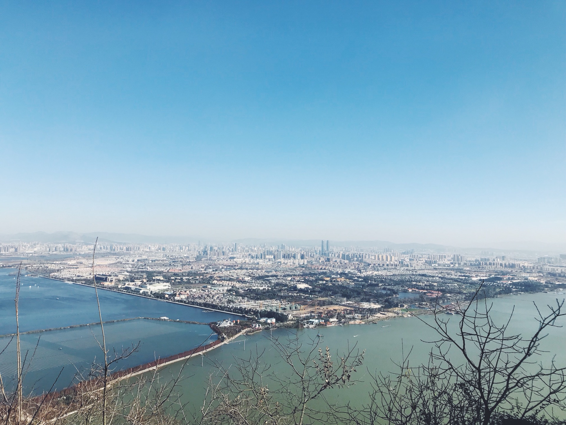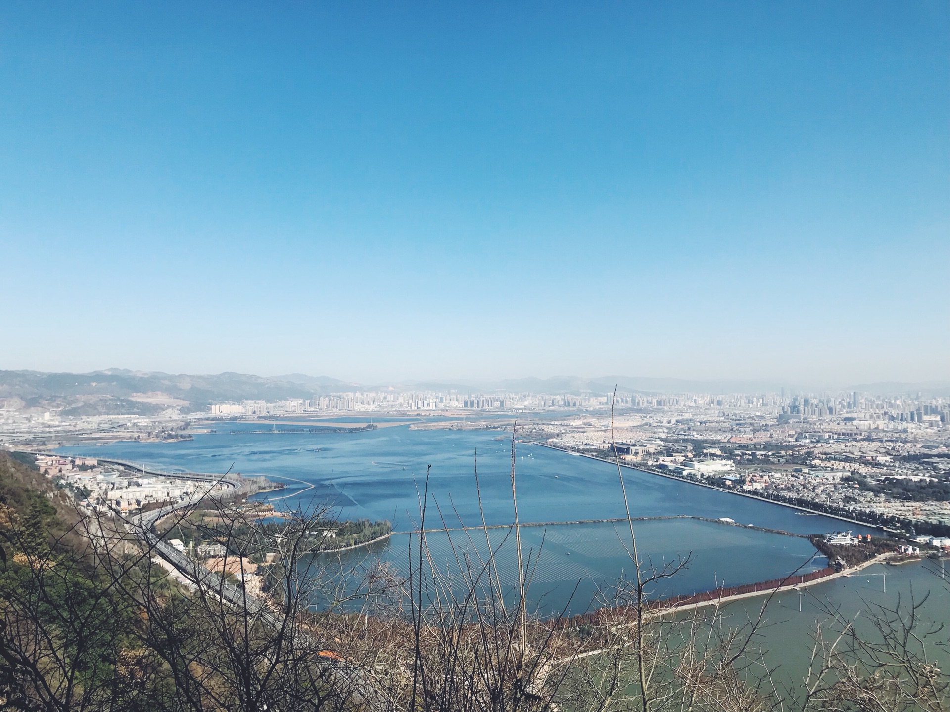 这里就可以看到壮观的滇池一景了,也可以清晰地分辨出两边的颜色差别。