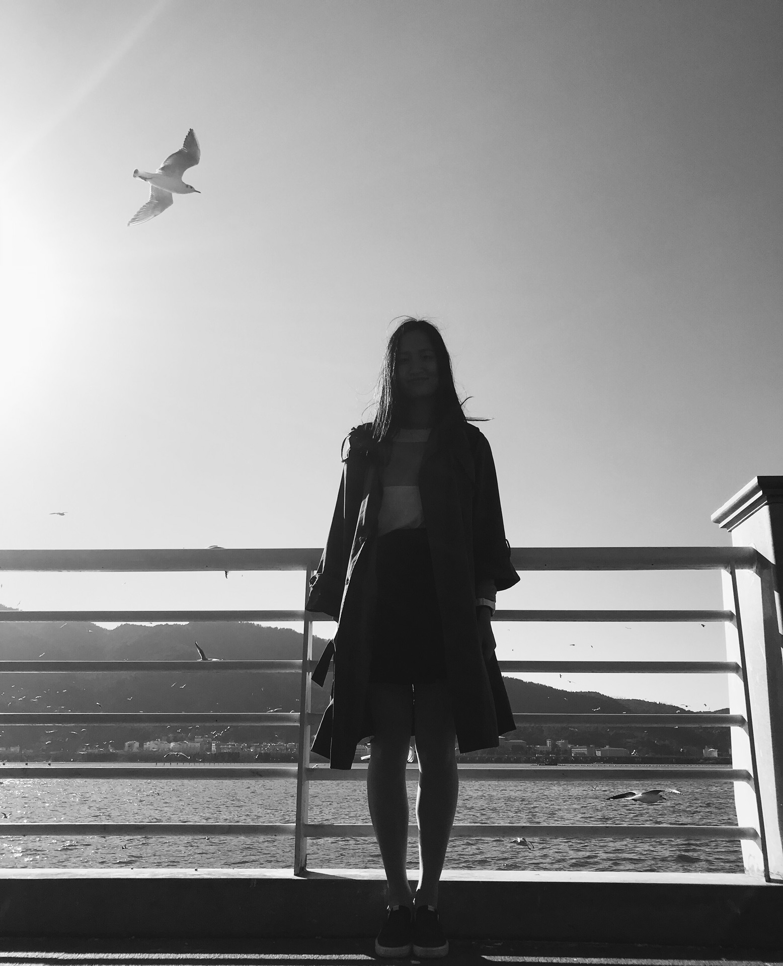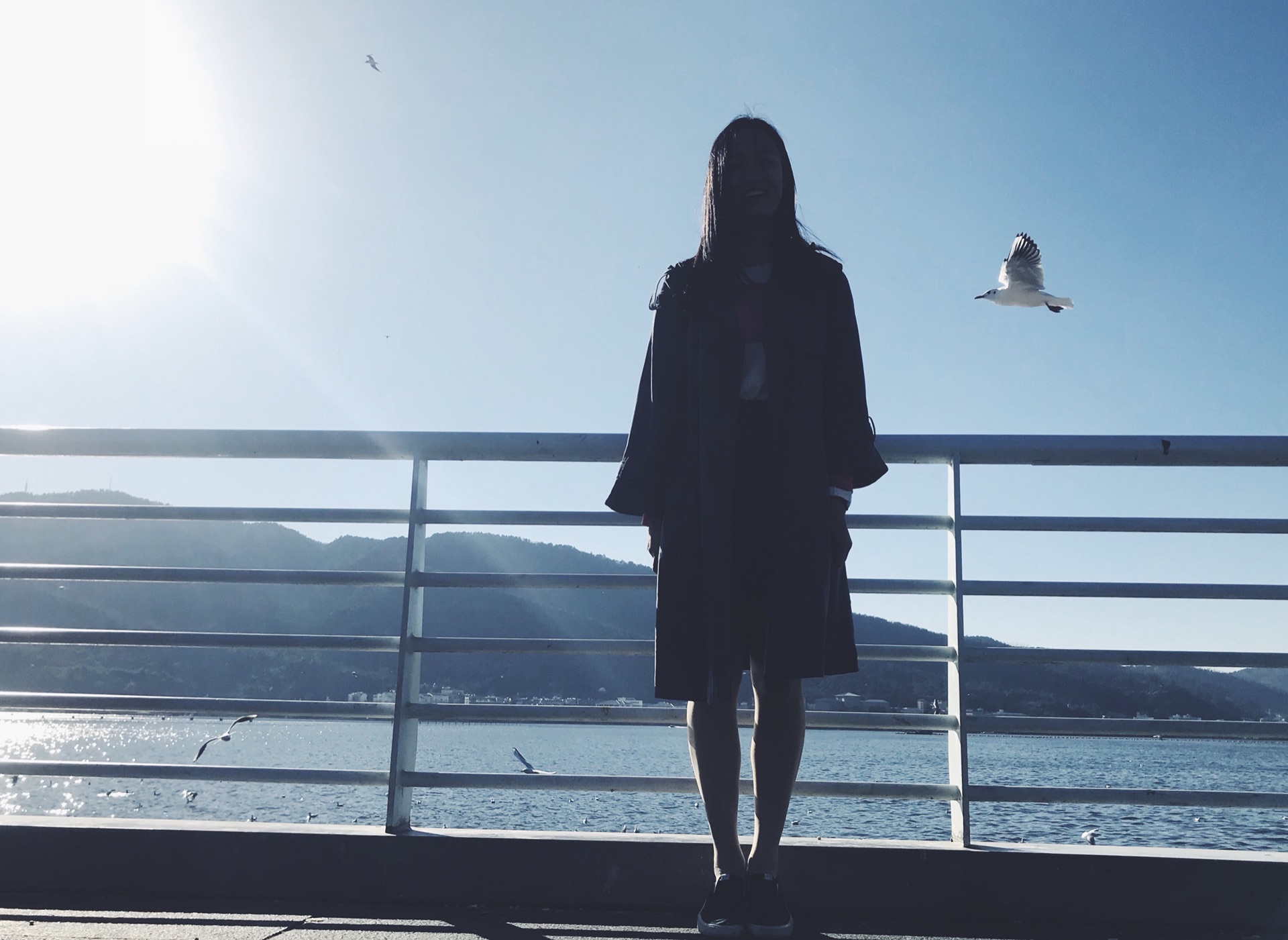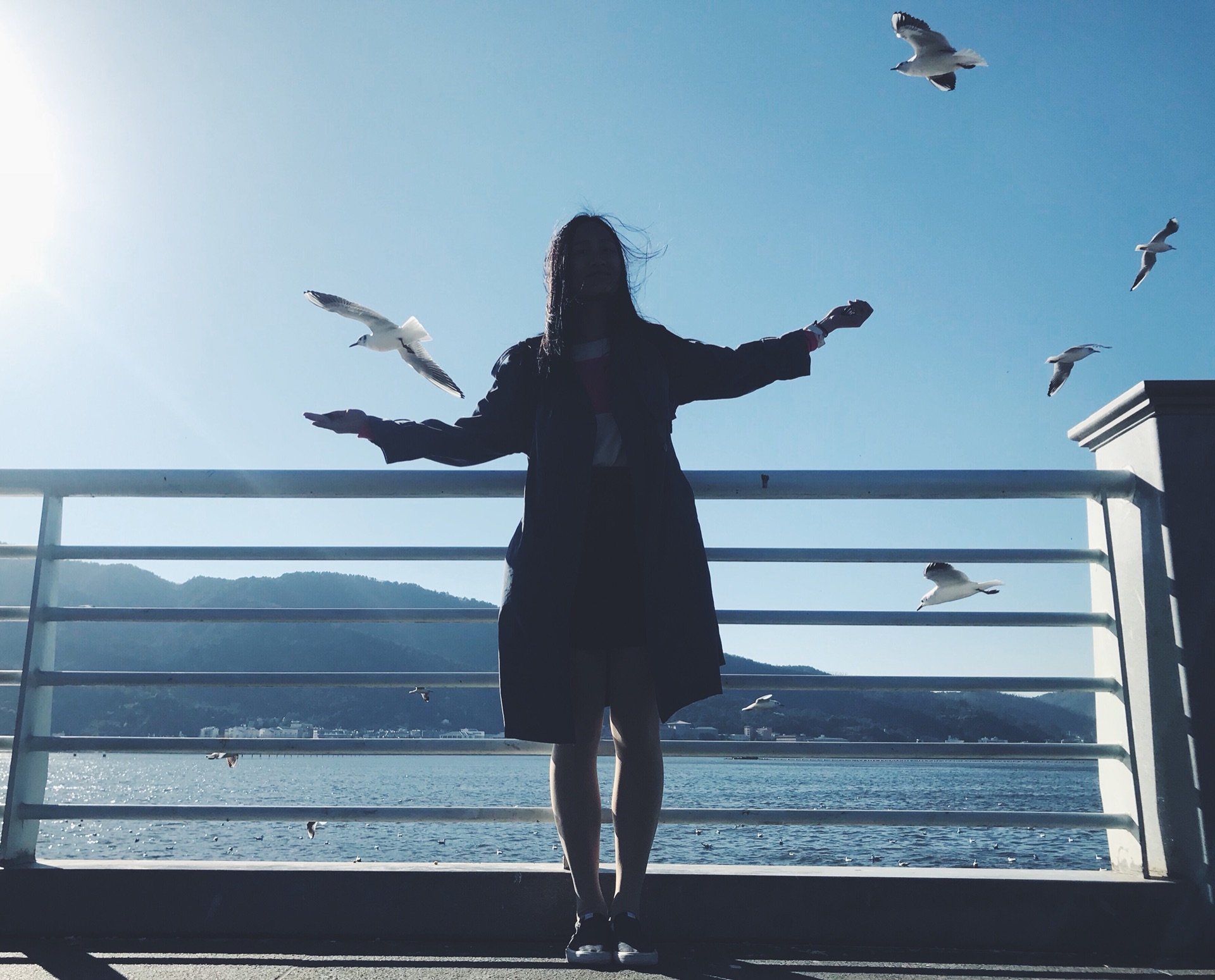 栏杆外站满了游人,大家伸出手,拿着买好的食物,等待海鸥的光顾,而有的海鸥则直接从我们的头上飞过。