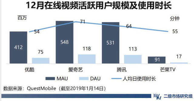 根据QuestMobile数据显示,截止2019年1月14日,在MAU、DAU方面,优爱腾三家视频平台还处于你追我赶的态势。优酷还需要更多的优质内容来拉动用户的增长。