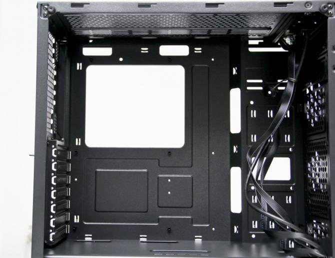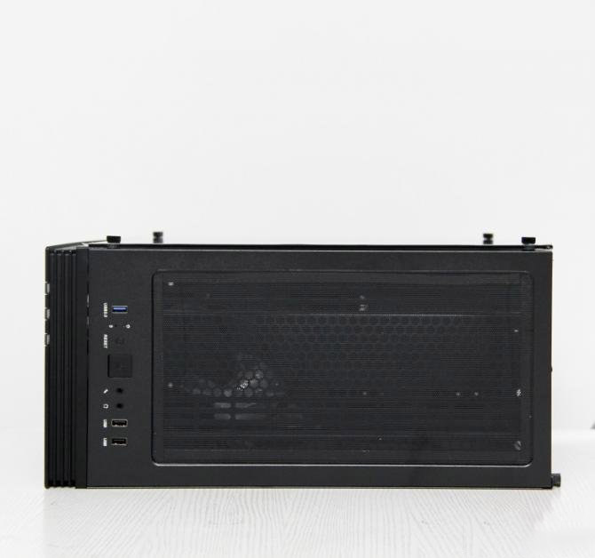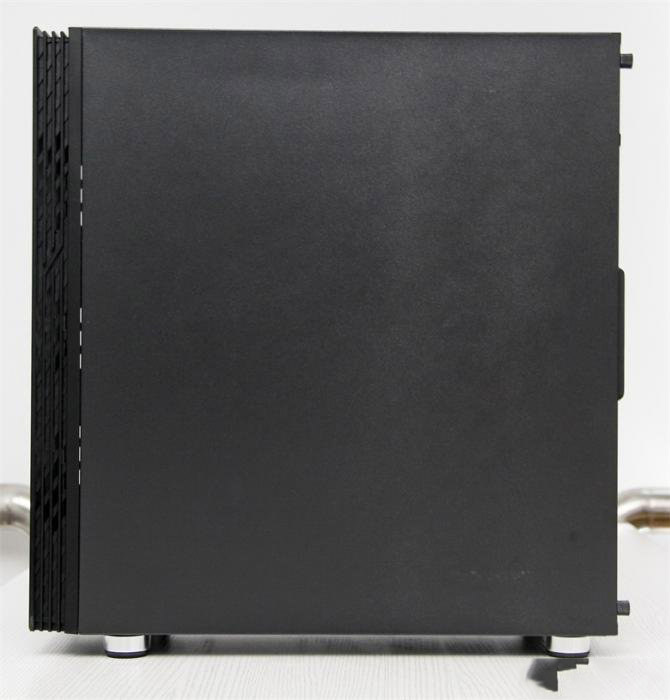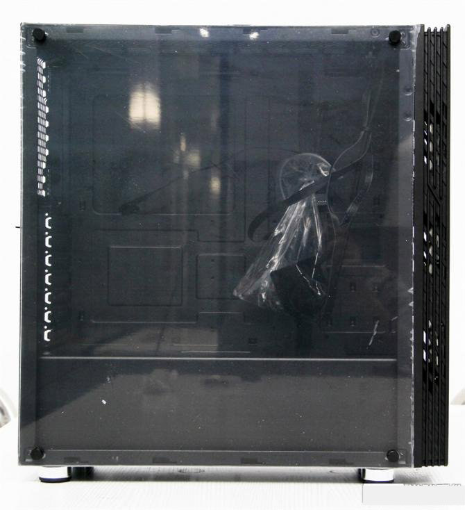 机箱右侧是一块完整的钢板,没有任何散热孔,目的也是让玩家们打造简单粗暴的前后水平风道,既简单散热效果也好。