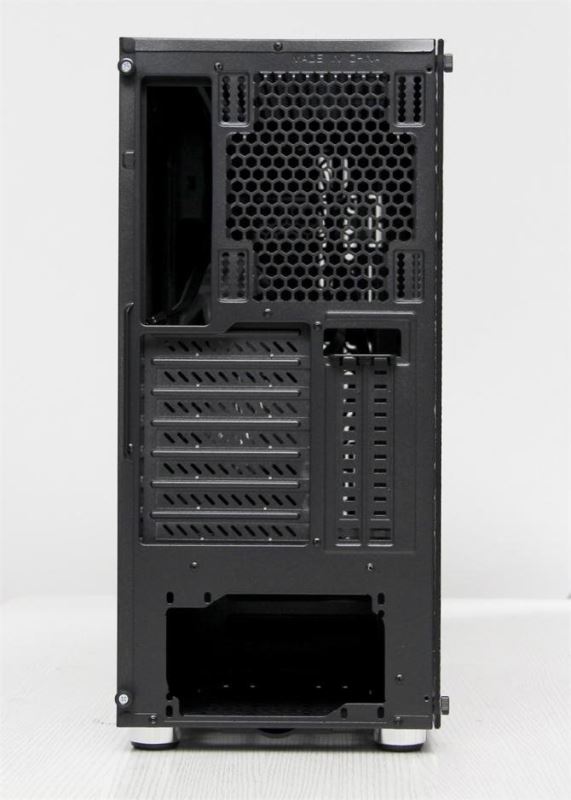 来到机箱后部,上方乍一看像电源位,其实这是散热风扇的安装位,并且从螺丝孔位的形状可以看出这里可以支持超多规格的散热风扇。下方有7个PCI-E槽位,ATX大板完美支持,旁边还有显卡直立摆放位,这也是现在新机箱流行的设计,不过机箱内没有附赠PCI-E延长线,有需求的玩家记得自行购买。下方是电源仓,采用了隐藏式设计,玩家们理线也可以稍微省点心了。