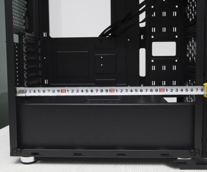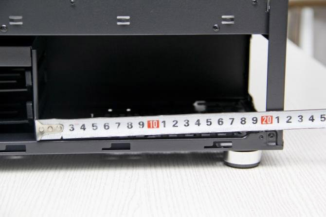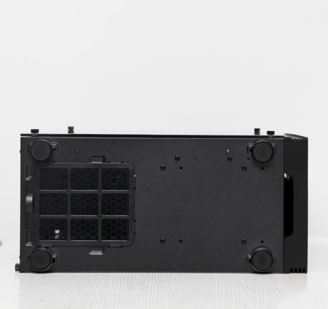 右边电源位可以放进215mm之内长的电源,散热孔的地方还有四个减震脚垫,减轻整个机箱的共振。