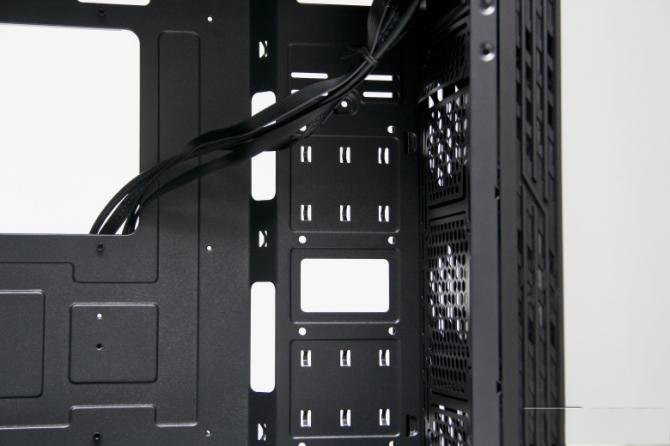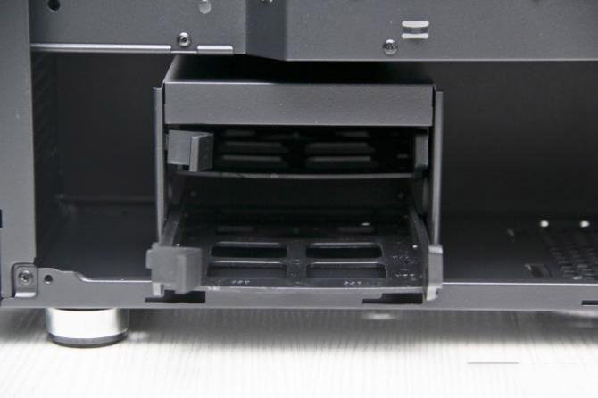 电源仓的背面我们发现了硬盘仓,采用了主流的抽屉式设计,并且整个硬盘仓是可以拆下来的,拆下之后可以方便玩家们安装前面风扇时拧螺丝,或者方便玩家改装水冷走位。
