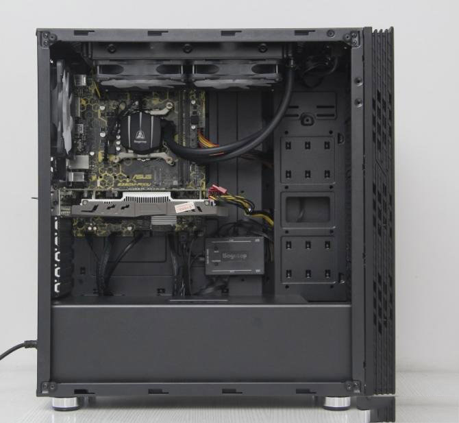 主板采用的是标准的大板型atx主板,而显卡采用的是较长板型的显卡,这样的配置能充分反映机箱内的空间大小,以及机箱内的各位置的兼容情况。显卡位,就不同介绍了,因为机箱电源仓前置,去掉了硬盘笼,机箱内部宽度非常足,目前市面上的游戏显卡都能安装进去。很都犯过一个小毛病,什么都选购好了,最后装机时发现装不下去,显卡长度没有考虑进去,结果机箱买小了,不得不想办法或者更换机箱,当然有的人是开放式主机。